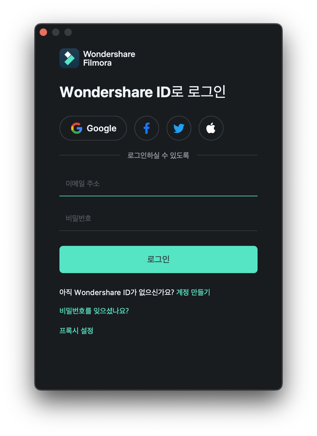 이때 필모라 원더셰어 로그인 창이 나타나기 때문에 로그인을 해줍니다. (해당 기능은 필모라를 구매한 유료 사용자만 사용할 수 있는 기능입니다)