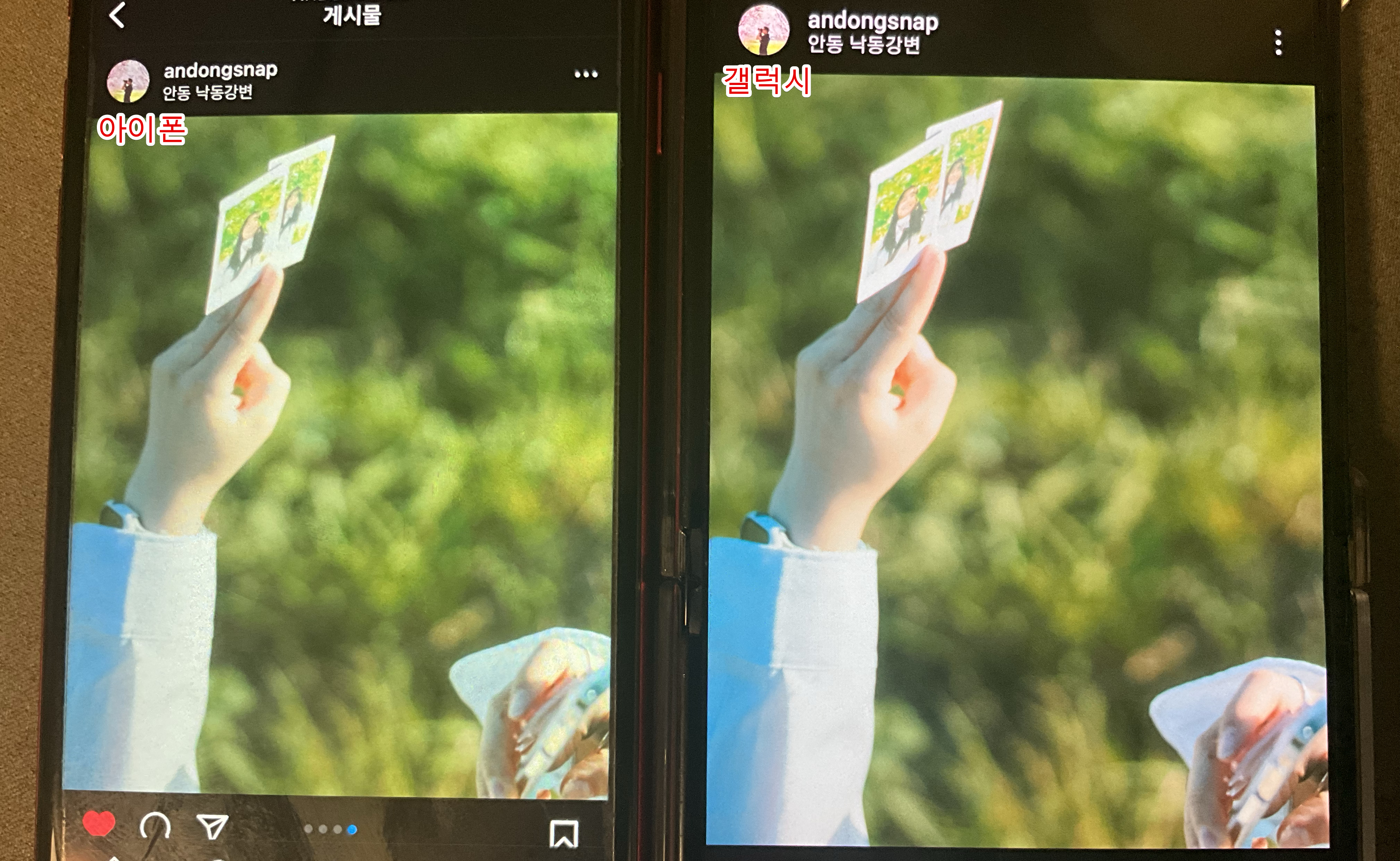 위 사진은 아이폰과 갤럭시의 똑같은 인스타그램 게시물을 보면서 찍은 사진입니다.