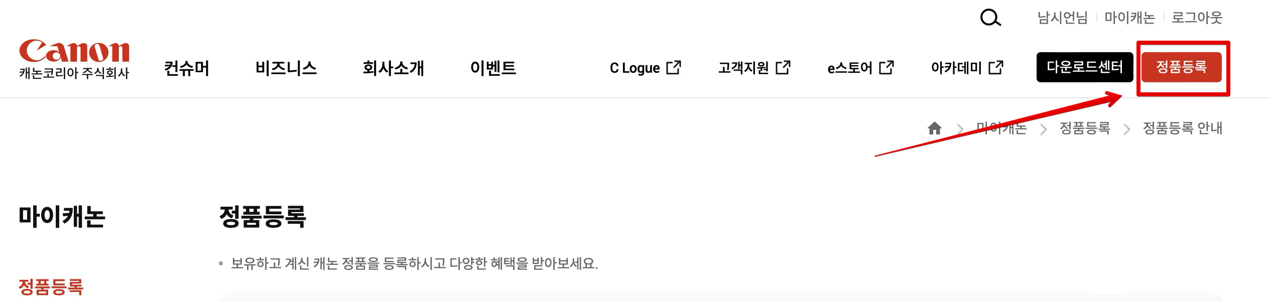 회원가입 후 로그인해주시고요. 그 다음 우측 상단에 보시면 빨간색으로 [정품등록]버튼이 있는데 이걸 클릭해줍니다.