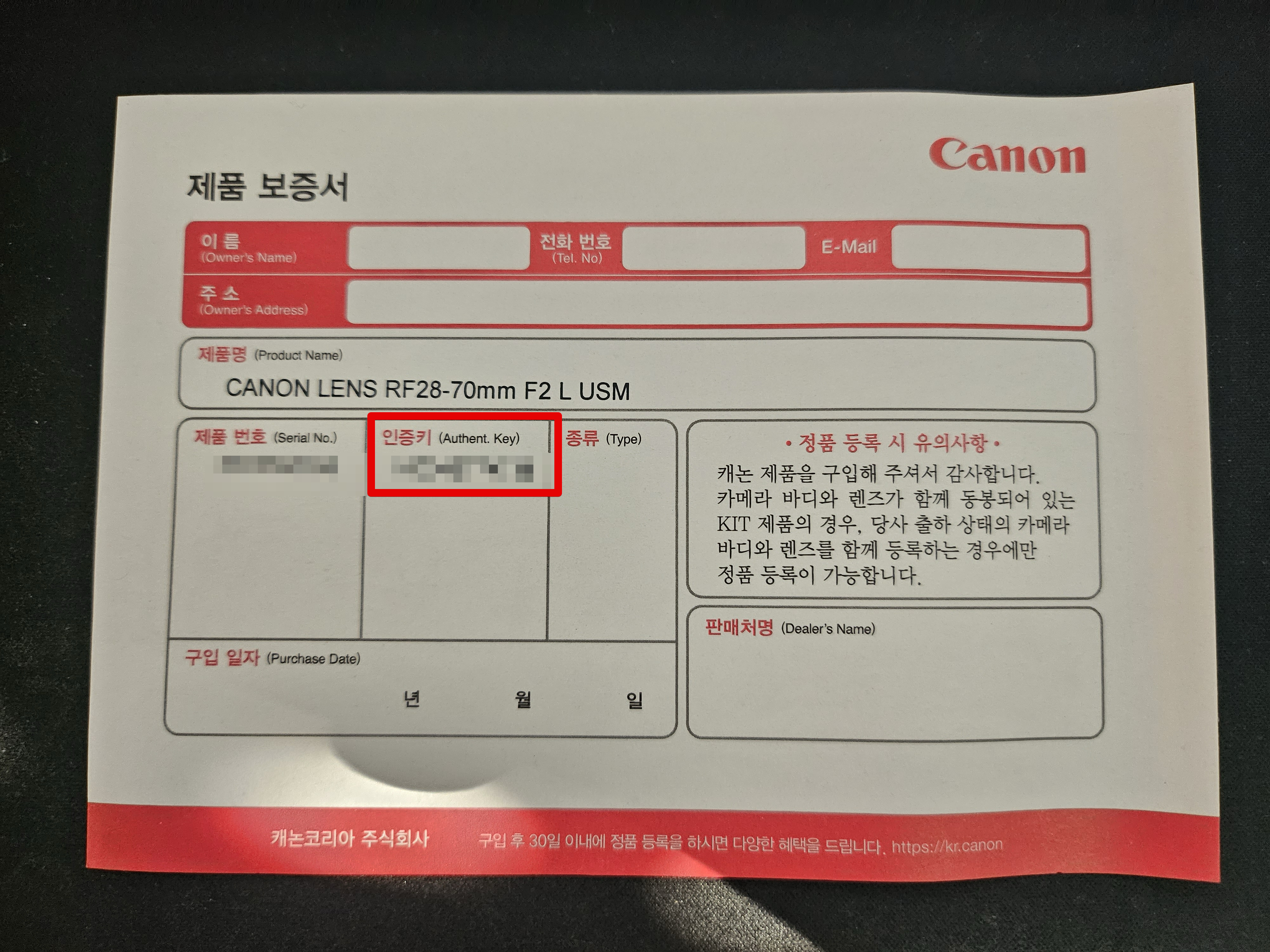 정품 등록을 위해서는 정품 구매 시 주어지는 제품 인증키가 필요합니다. 제품인증키는 구매한 제품(카메라 또는 렌즈) 박스 안에 종이로 들어있는데, 여기에서 중요한게 인증키입니다.