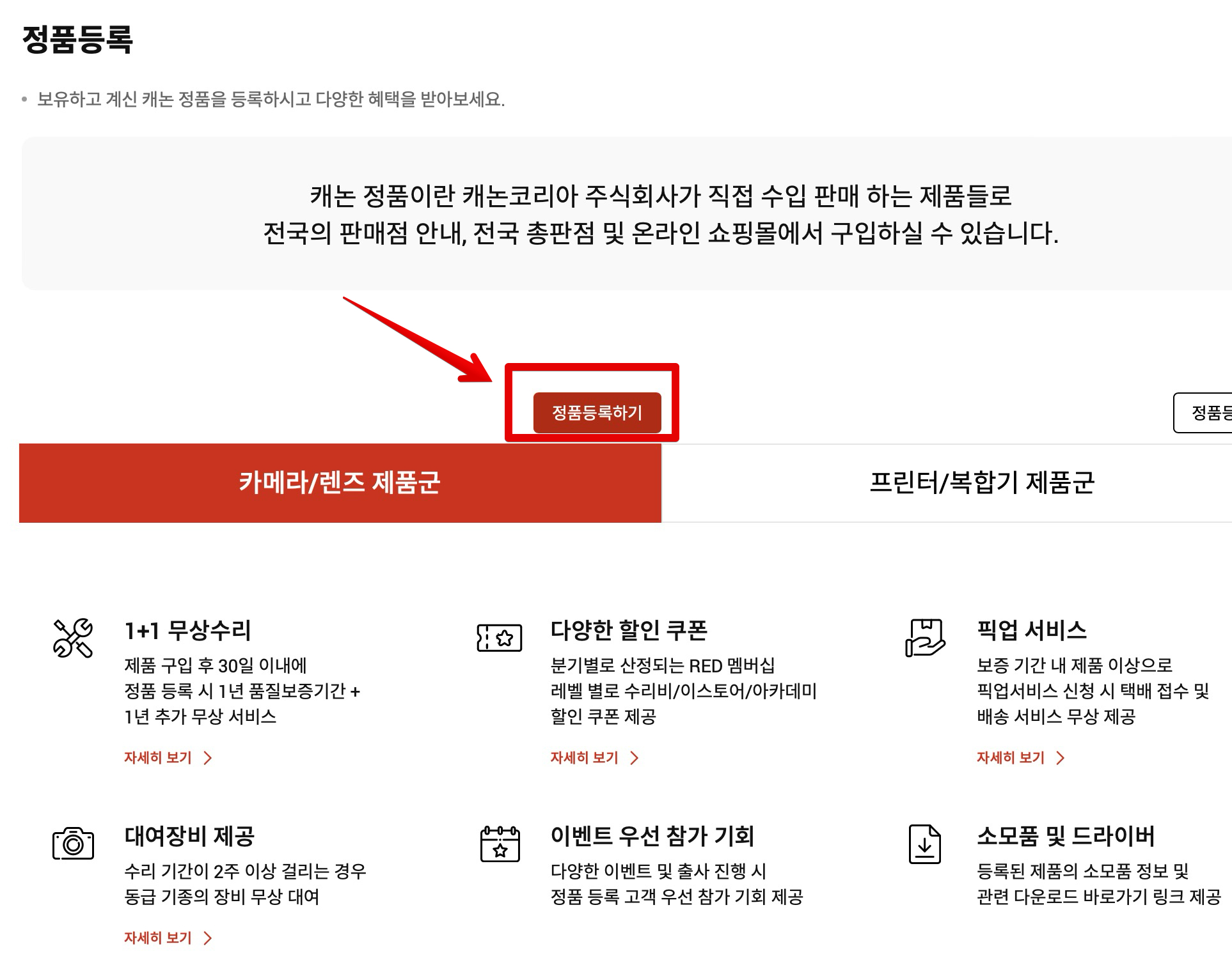 정품등록 페이지가 나타납니다. 여기에서 카메라/렌즈 제품군을 정품등록하는 버튼이 있고, 프린터나 복합기 제품군을 정품등록하는게 있는데 지금은 카메라 또는 렌즈를 정품등록하려고 하는 것이므로 왼쪽에 있는 [정품등록하기]를 클릭합니다.