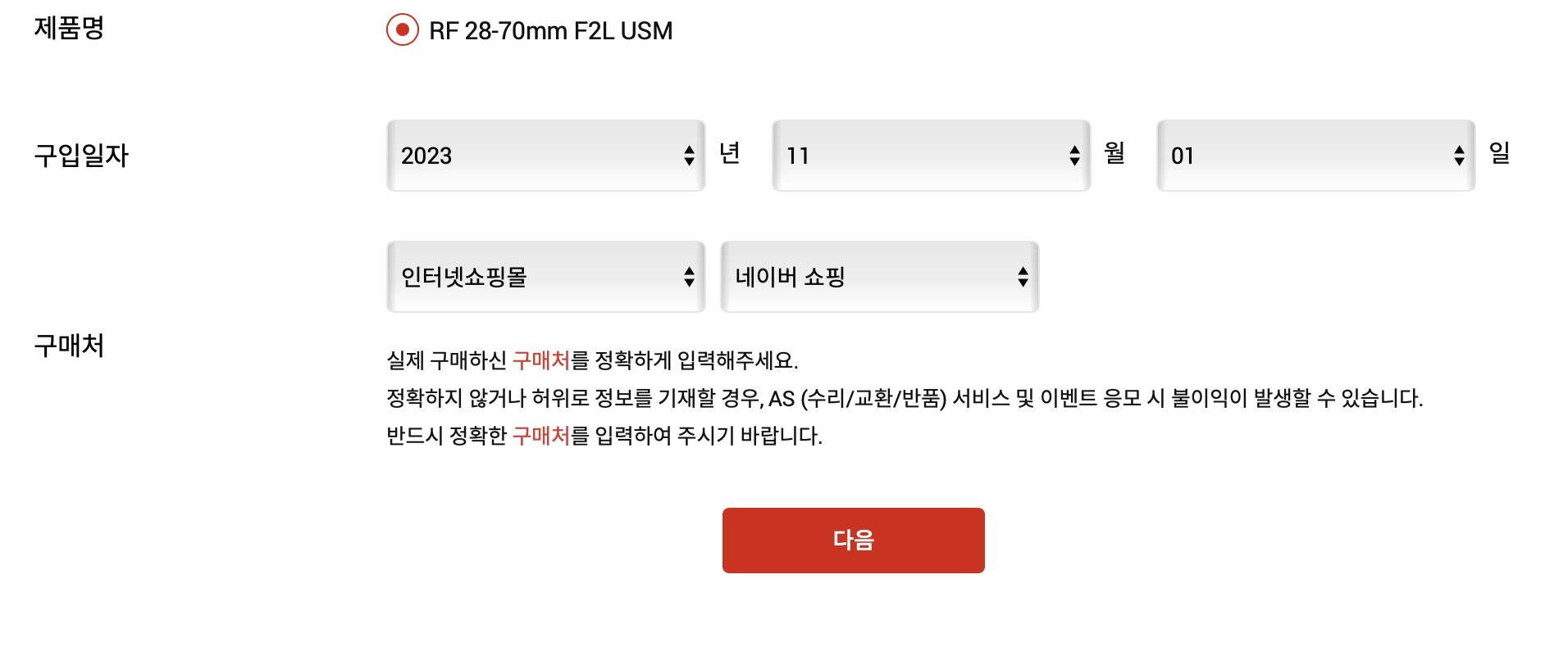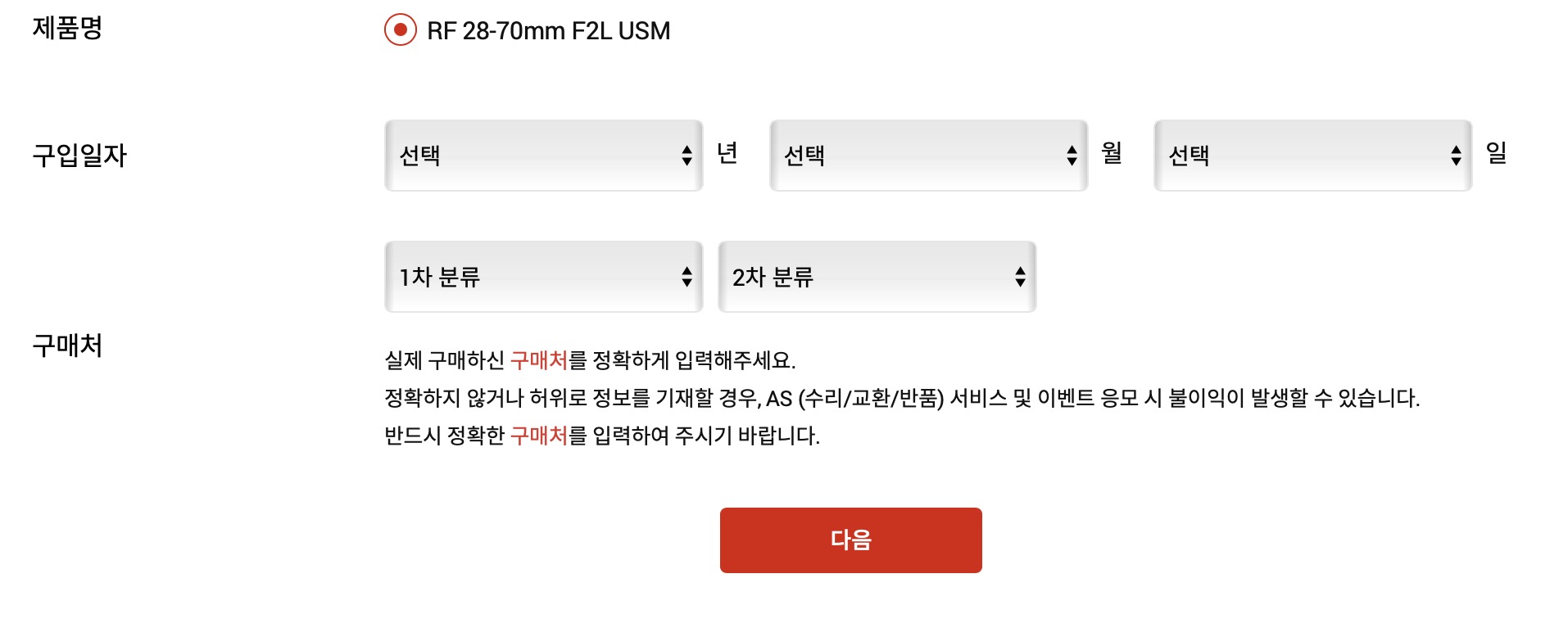 제품명과 구입일자, 구매처를 물어보는 항목이 나타납니다. 여기에서 제품명이 정확한지 체크해주시고요. 구입일자의 경우에는 나중에 영수증 첨부해서 보증기간을 조정신청을 해야하기 때문에 기억나는대로 해주시면 되며, 구매처의 경우에도 가능하면 정확하게 해주시면 좋습니다.