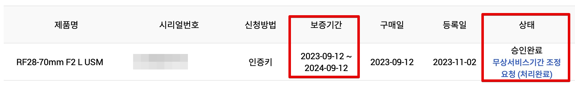 끝으로 다시 정품등록 현황을 확인해보면, 승인완료되었으며 무상서비스기간 조정요청이 심사 중이라는 파란색 메시지가 나타납니다. 이게 심사가 며칠 정도 소요되는걸로 알고 있습니다. 심사가 완료되면 보증기간이 구매일로부터 다시 계산이 될 것인데, 저도 이번에 직접 정품등록하면서 포스팅하고 있는 중이라서 심사가 끝나면 이 블로그 포스팅 밑에 내용을 추가하도록 하겠습니다.
