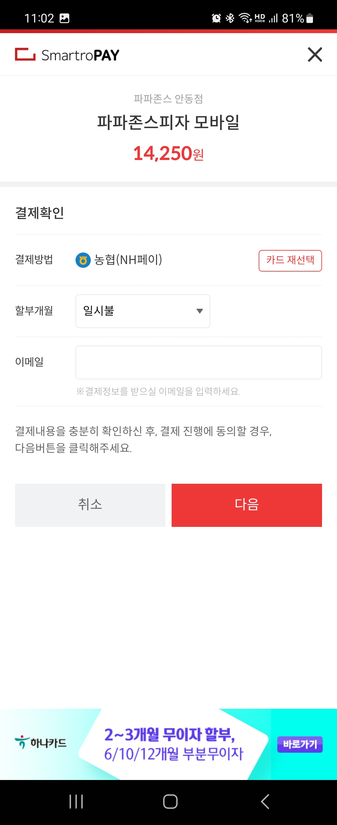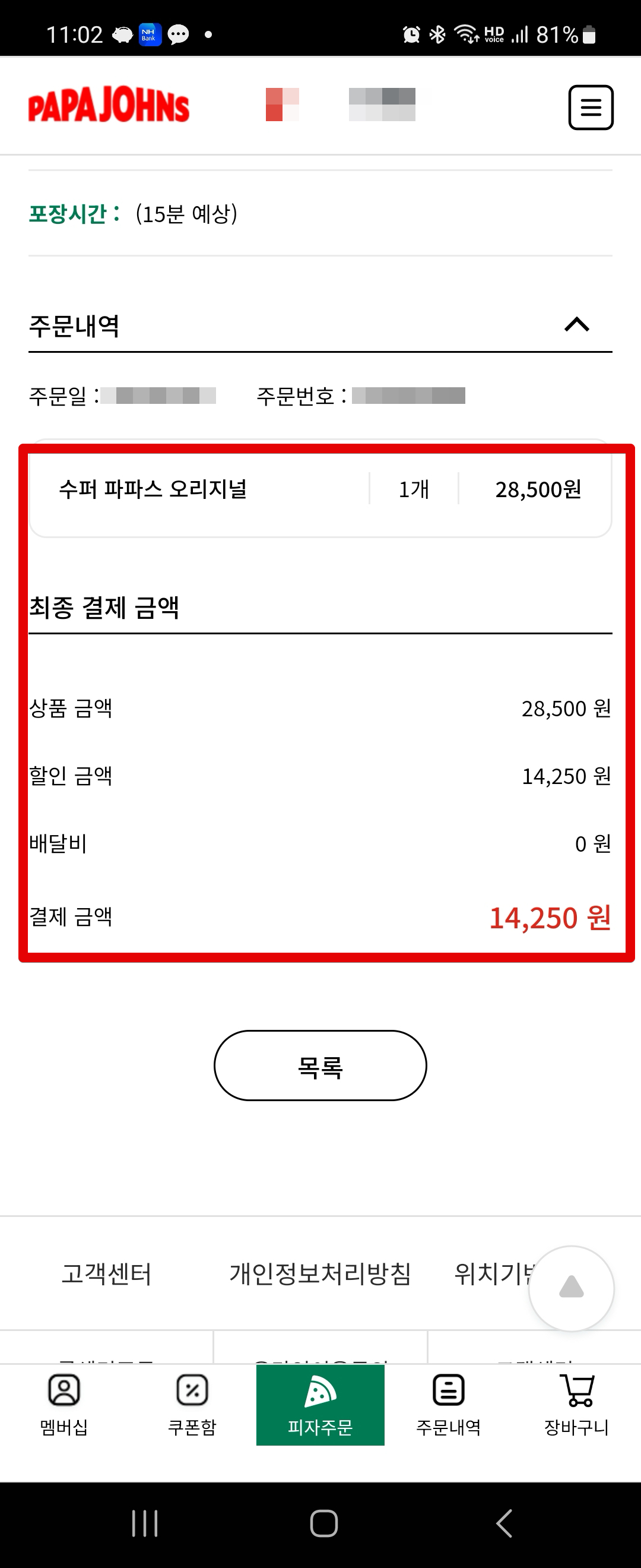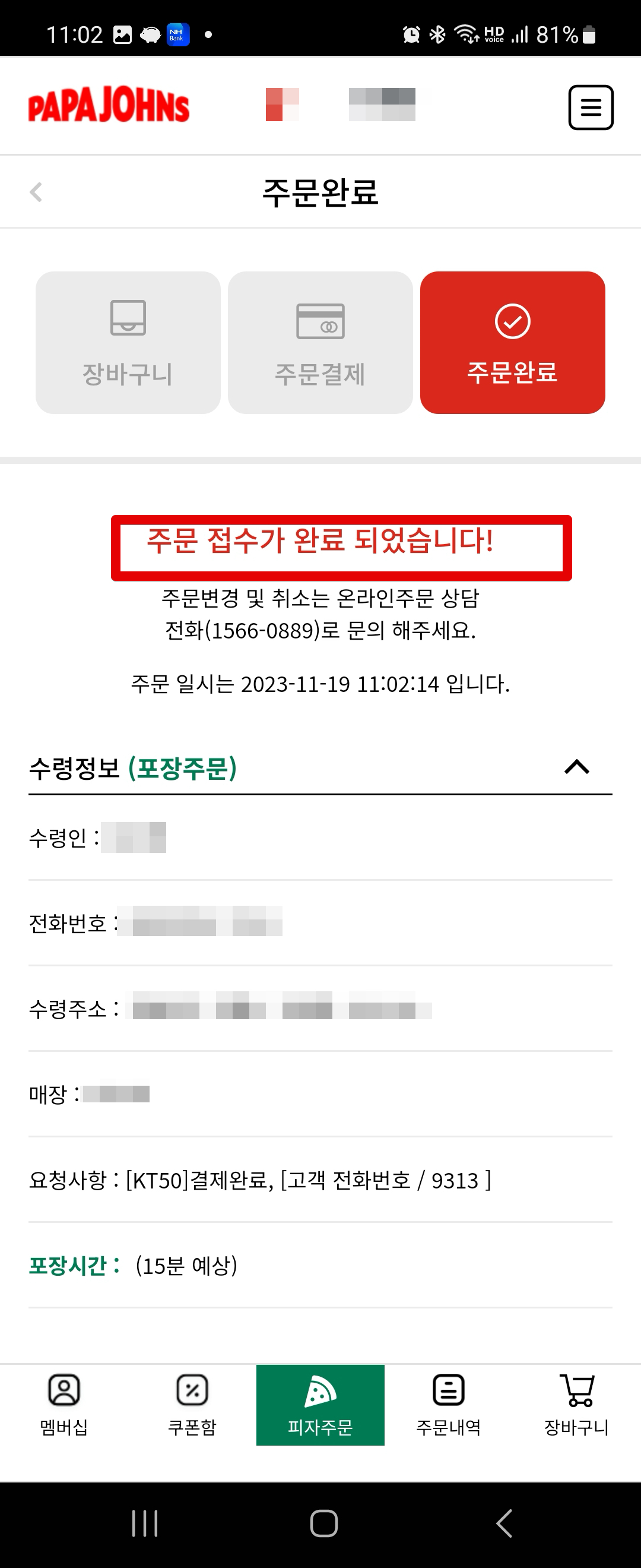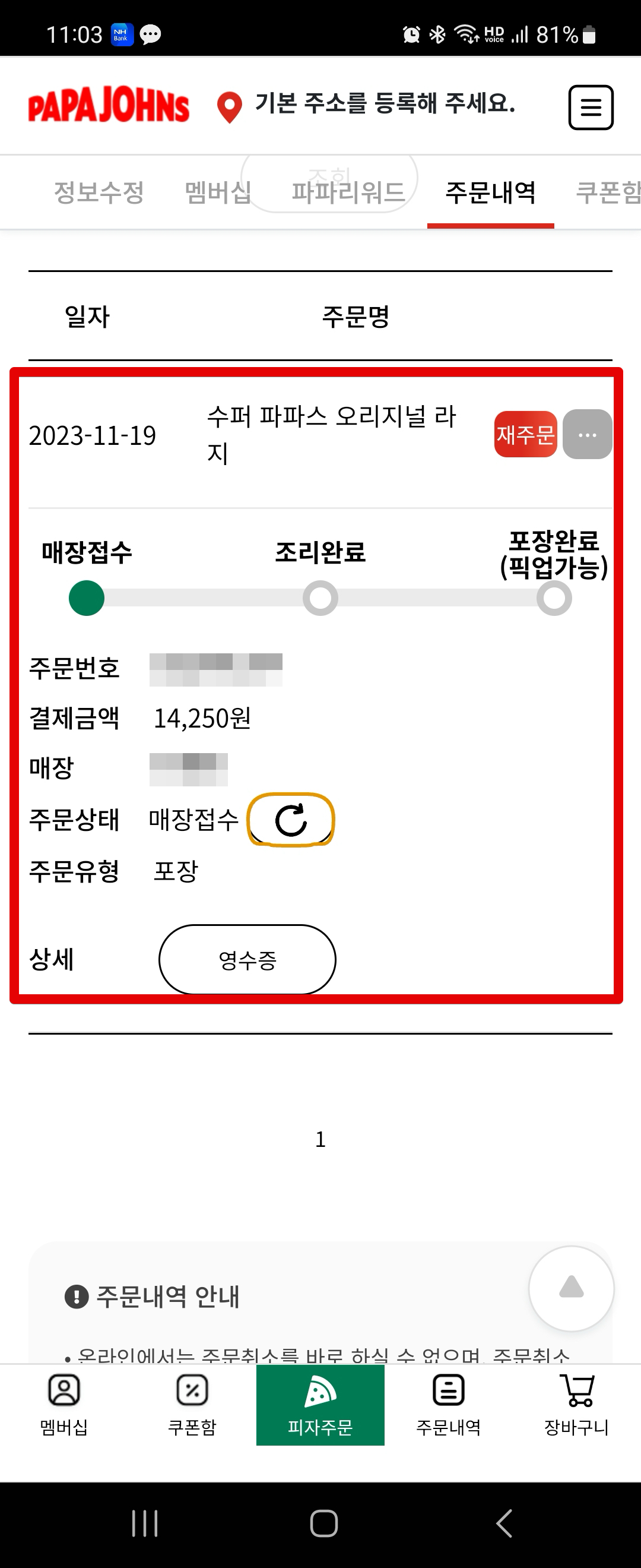 결제가 끝나면 주문 접수가 완료되었다고 뜨고요. 파파존스 앱에서도 주문내역을 확인할 수 있습니다.