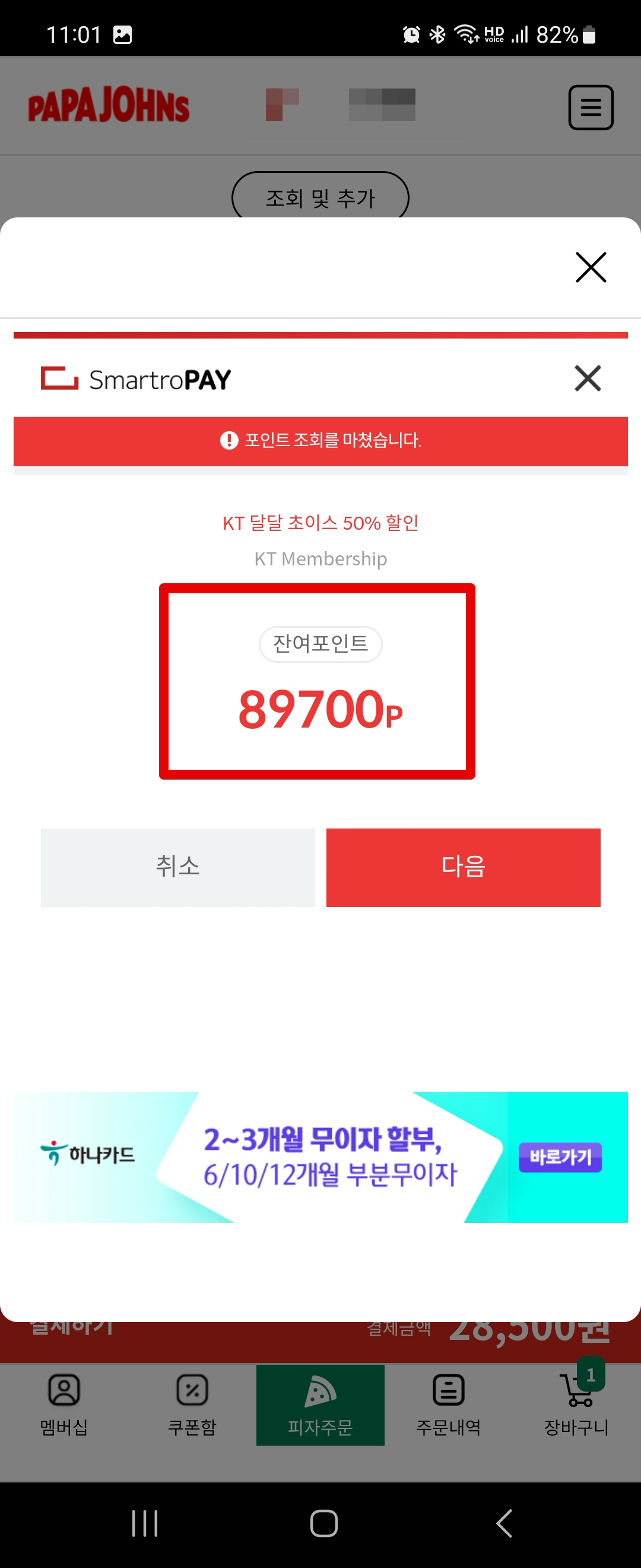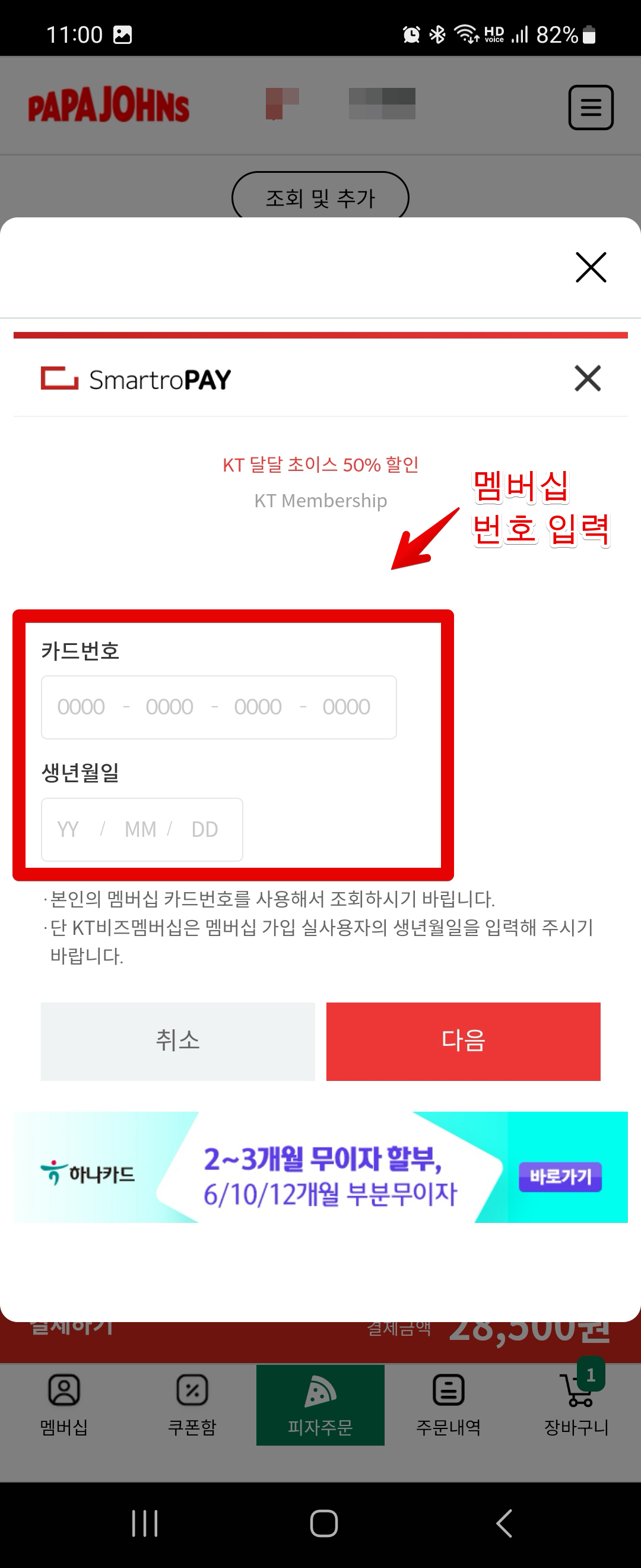주문결제창이 나올 때 까지 먼저 진행해줍니다. 파파존스 첫 화면에서 먹고싶은 피자를 선택해주시면 됩니다. 그 다음으로 주문결제 창에서 아래쪽에 있는 [제휴 할인] 버튼을 클릭하고 [KT 달달 초이스]를 클릭하세요. 이렇게 하면 카드번호와 생년월일을 입력하는 창이 나오는데요. KT멤버십 카드번호를 모르신다면, KT멤버십 앱을 처음 실행하면 첫화면에 바코드와 카드번호가 나오는데 이걸 입력해주면 됩니다.