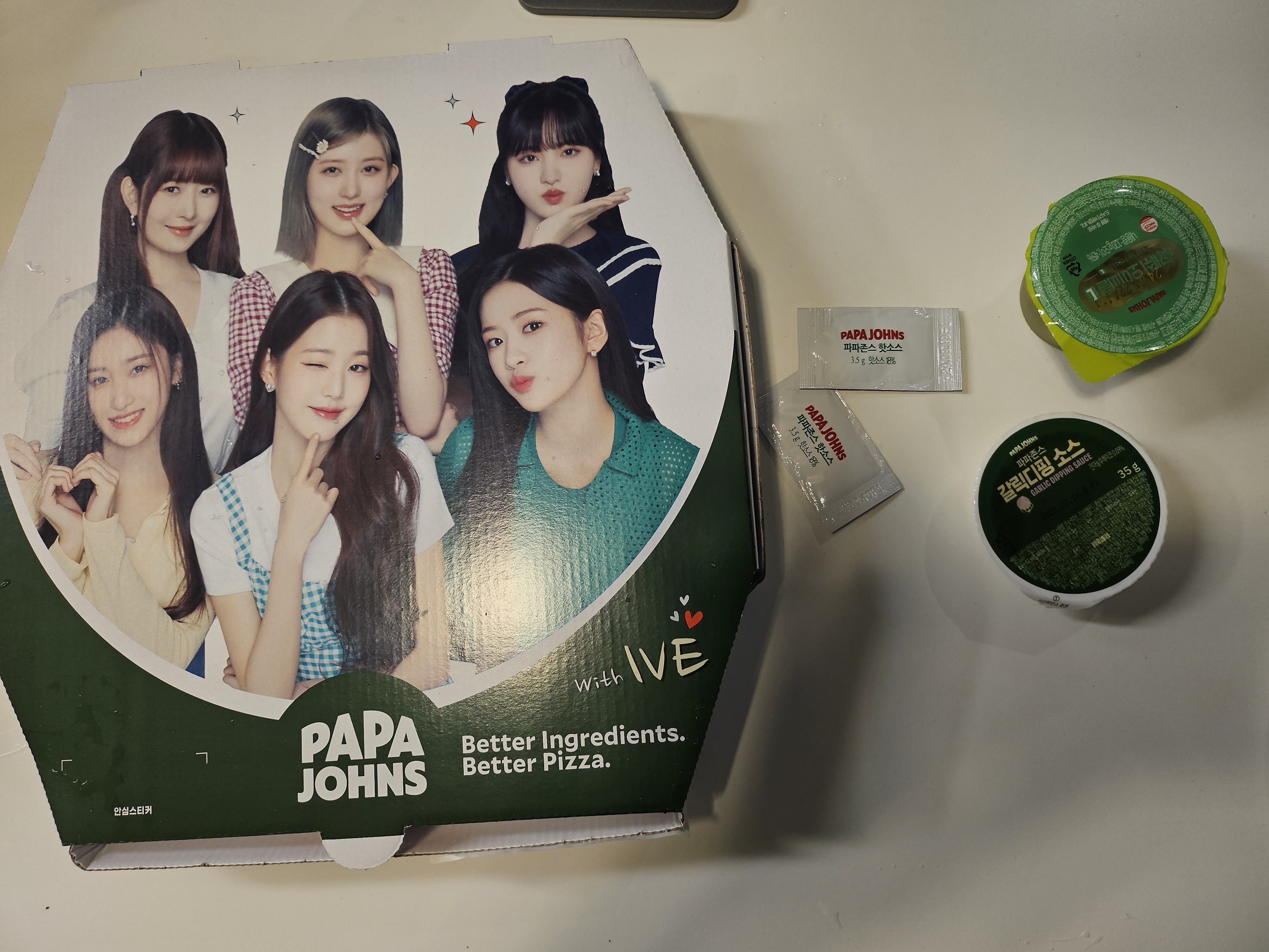 갈릭디핑소스와 핫소스 2개, 그리고 피클이 기본 포함돼 있습니다. 음료는 기본 포함이 아니라서 별도로 추가하거나 집에 있는거 먹으면 될 것 같네요. 개인적으로 파파존스의 갈릭디핑소스 맛이 좋더라고요. 색상은 노란색이라서 좀 별로였지만 맛은 훌륭합니다!