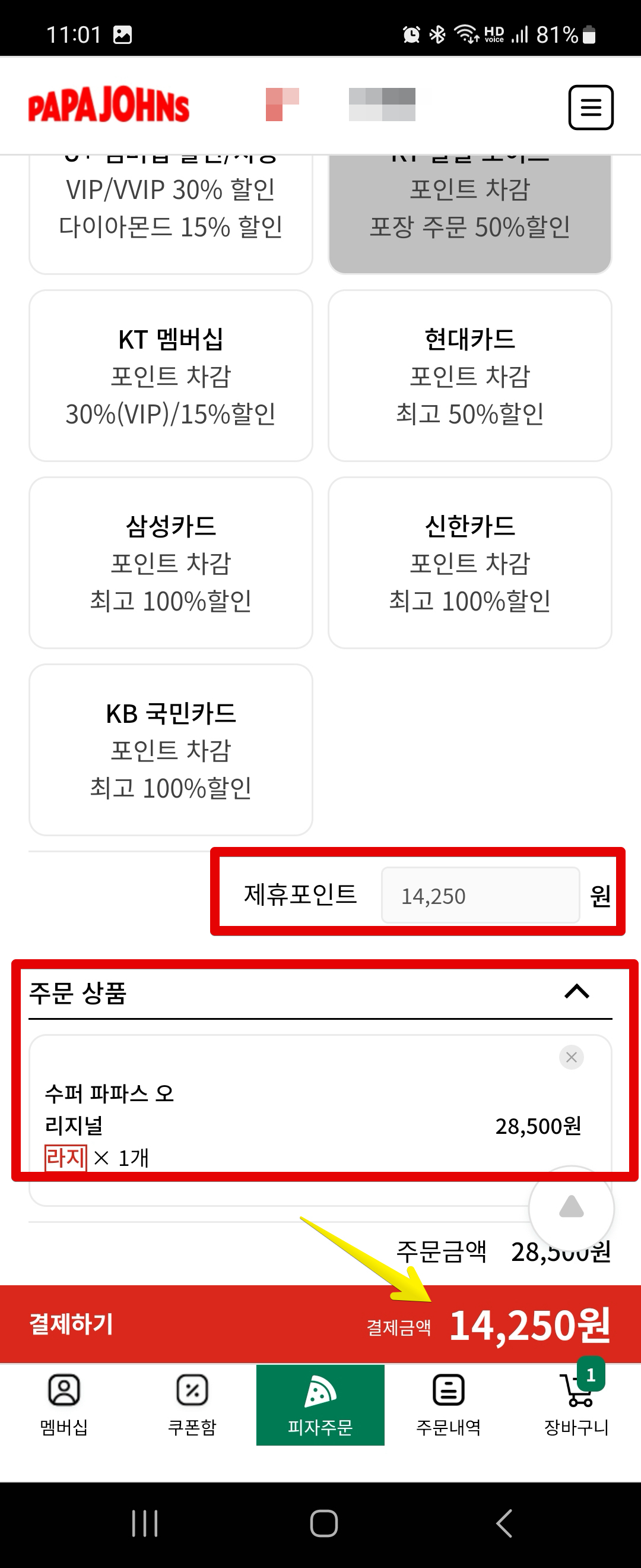 예를들어 제가 파파존스에서 좋아하는 수퍼 파파스 오리지널을 골라보았습니다. 라지 사이즈 피자 기준으로 가격이 28,500원입니다. 파파존스가 피자 가격이 나름 꽤 있는 편인 것 같아요. 여기에서 50% 할인을 받아서 14,250원 할인을 받고(포인트 차감), 나머지 잔액인 14,250원을 계산하면 됩니다.