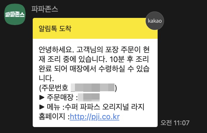파파존스 앱보다 이렇게 카톡으로 알림톡을 주기 때문에 이게 확인하는게 더 편리하더라고요. 파파존스가 집에서 조금 거리가 있어서 주문 하자마자 바로 출발하였는데 주문접수가 몇분 걸려서 실제 조리는 10분~15분 정도가 소요되는 것 같습니다. 해당 시간 07분에서 10분 후 조리 완료된다고 알림톡이 왔지만, 실제로는 13분 정도 걸렸습니다.