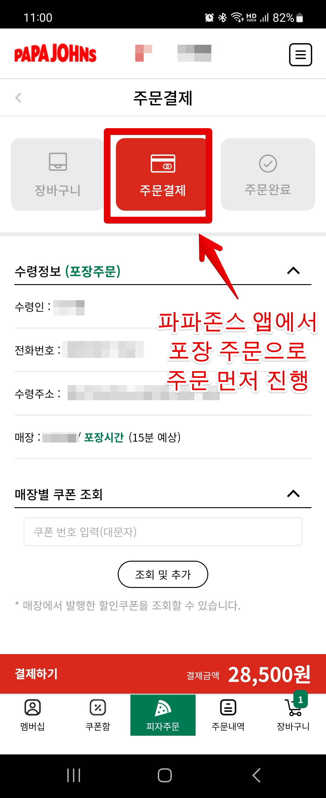 파파존스 방문해서 포장 왔다고 말하면, 휴대폰번호 끝자리를 물어보는데 끝자리 얘기해주면 됩니다.