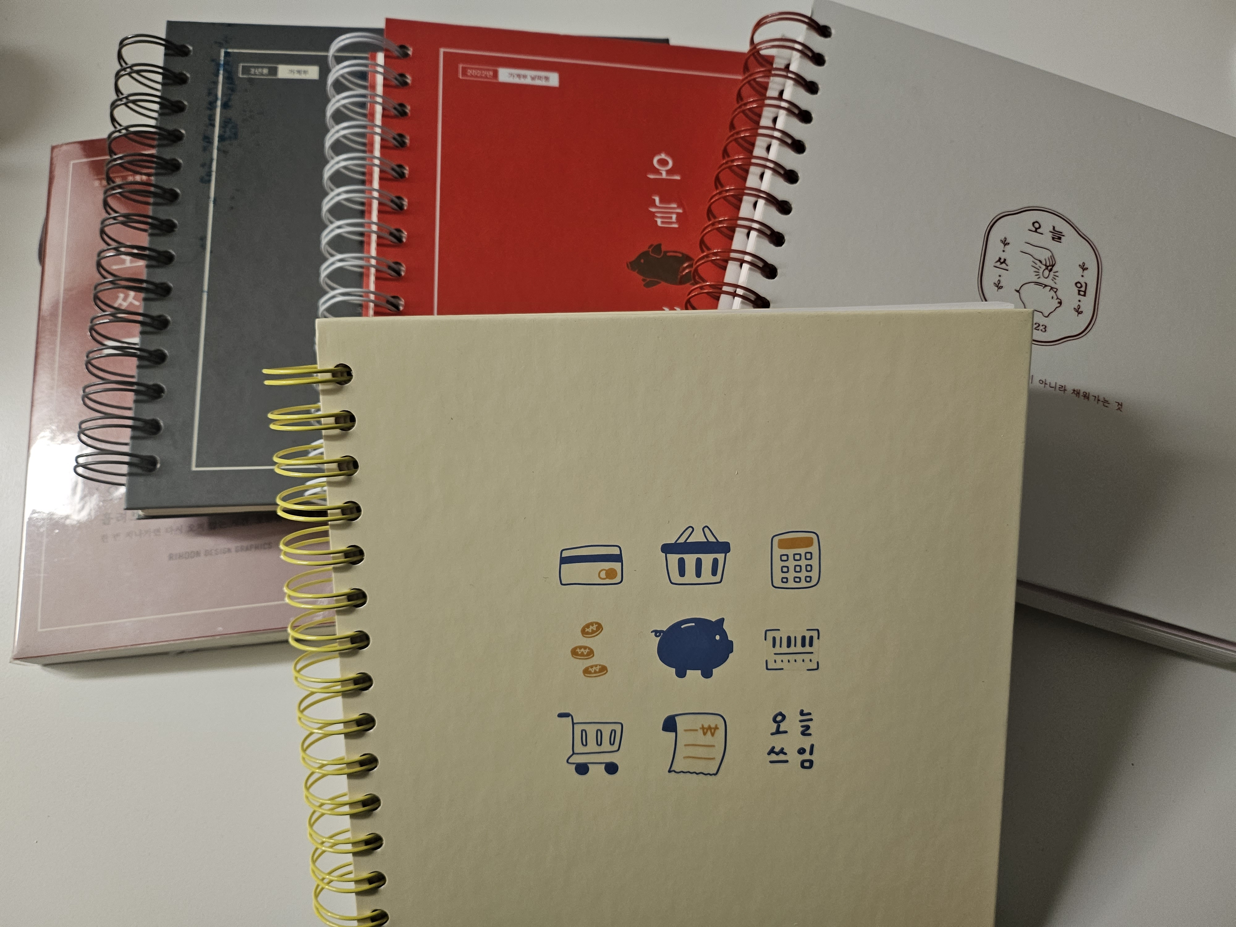 리훈 오늘쓰임 가계부는 매년 표지 디자인이 바뀌고 있어요. 그래서 매년 알아보기가 쉬운데, 나중에 10년이 넘어서 10권 이상이 되면 아무래도 디자인만으로는 파악하기가 힘들것 같아서 나중에 표지에 견출지를 붙여줄 생각입니다.