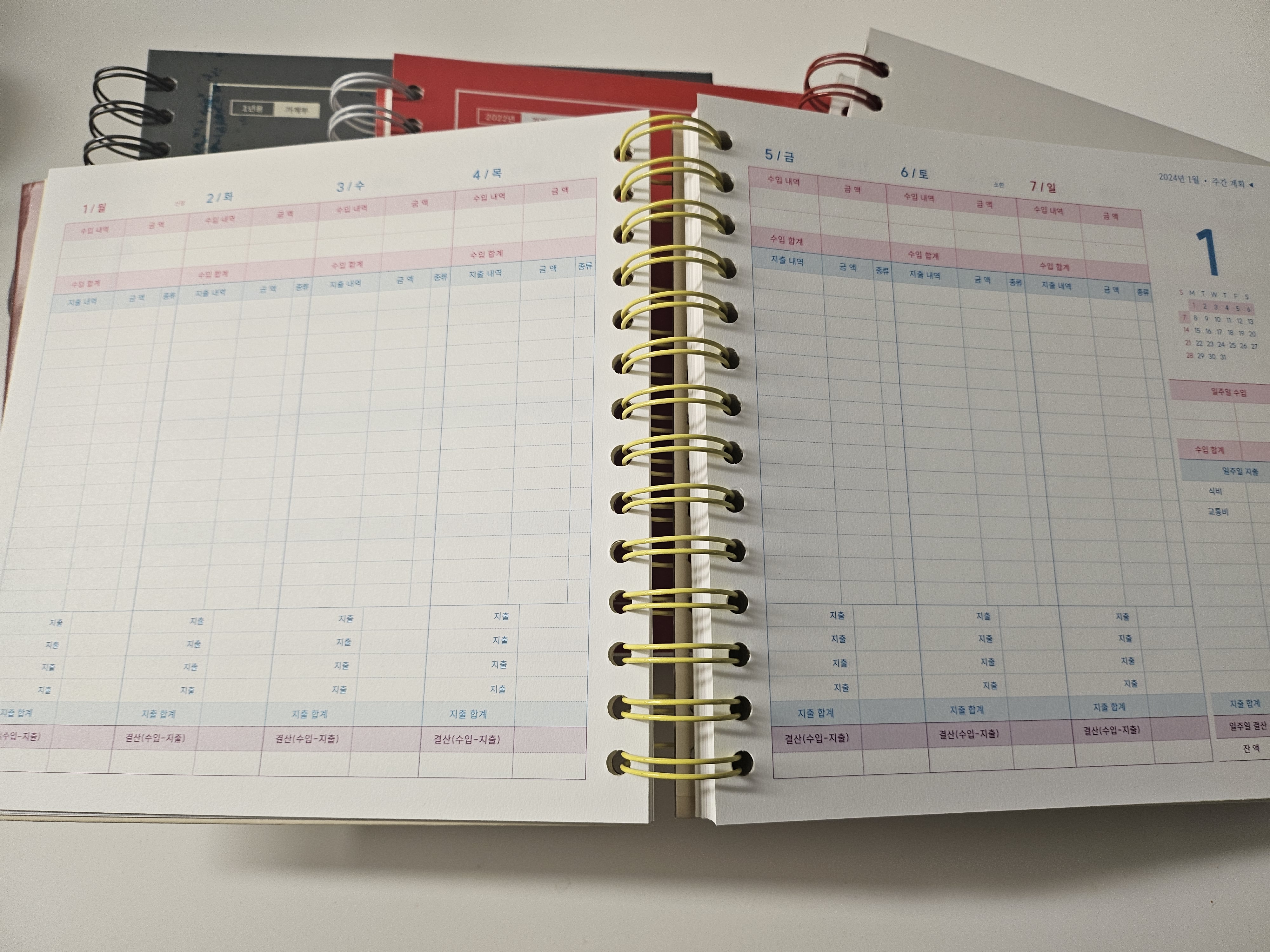 리훈 오늘쓰임 가계부는 2가지 스타일이 있습니다. 날짜기입형이 있고, 날짜 칸이 비워져 있는 만년형이 있는데요. 저는 날짜기입형을 선호합니다. 일주일이 월~일요일까지로 직관적으로 디자인이 되어 있습니다. 몇년째 서보니까 리훈 가계부도 비교적 여러번 업데이트가 되고 내용 개선이 되고 있는데, 2023년과 2024년은 대체로 디자인이 비슷합니다. 오히려 익숙해서 더 좋네요.