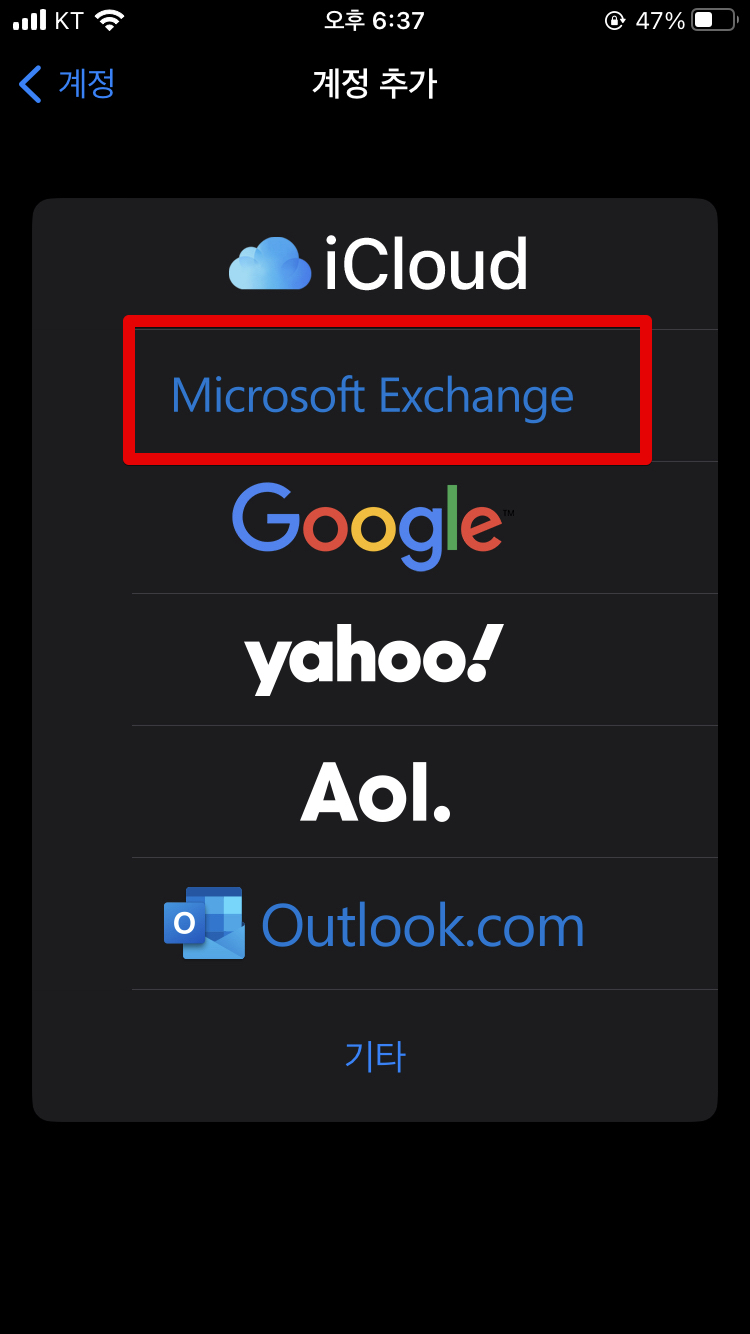 이번 글에서 핵심 내용입니다. 지난번 글에서 아웃룩으로 연동을 하였었는데 이번에는 또 이상하게 아웃룩으로 연동이 안되고, 또 기존에 사용할 때 동기화가 좀 느려가지고 답답하기도 했었고, 가끔 동기화가 멈춰가지고 업데이트가 안되었던적이 있었거든요. 그래서 이번에 다시 Exchange로 연동해주었습니다.