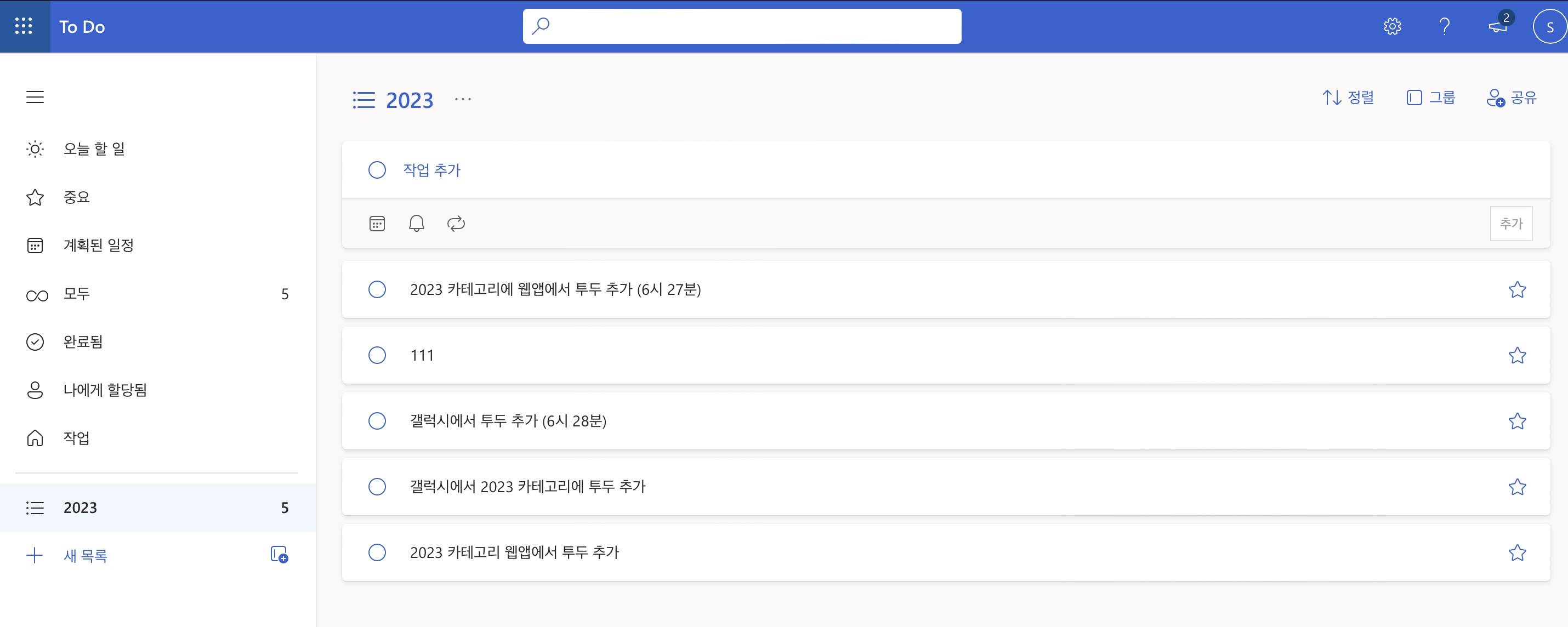 이것도 조금 오류가 있는 것인지... 기존에 쓰던 카테고리가 있었는데 이번에 새롭게 접속해보니 기존 카테고리가 나타나지 않습니다. (위에 있는 태스크들은 모두 테스트로 금방 입력한 것들입니다)