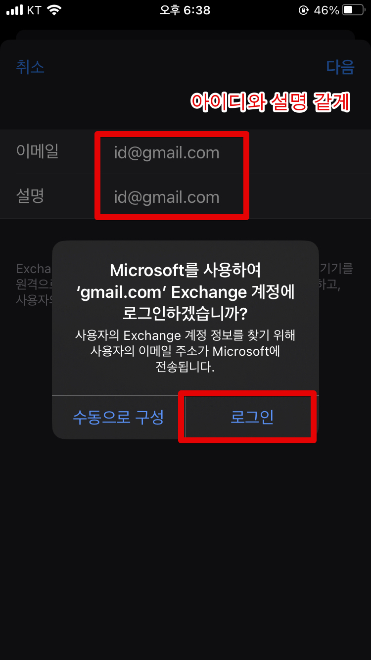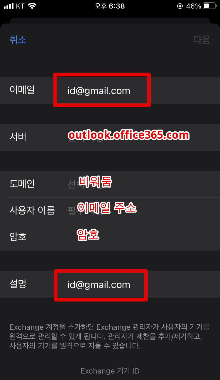 일단 계정 추가에서 [Microsoft Exchange]를 클릭합니다. 그리고 이메일과 설명 입력란이 나오는데 설명란에는 사실 아무거나 적어도 관계없다고 알고 있습니다만, 자꾸 실패가 떠서 이메일 주소와 설명의 주소를 똑같게 만들어주었습니다.