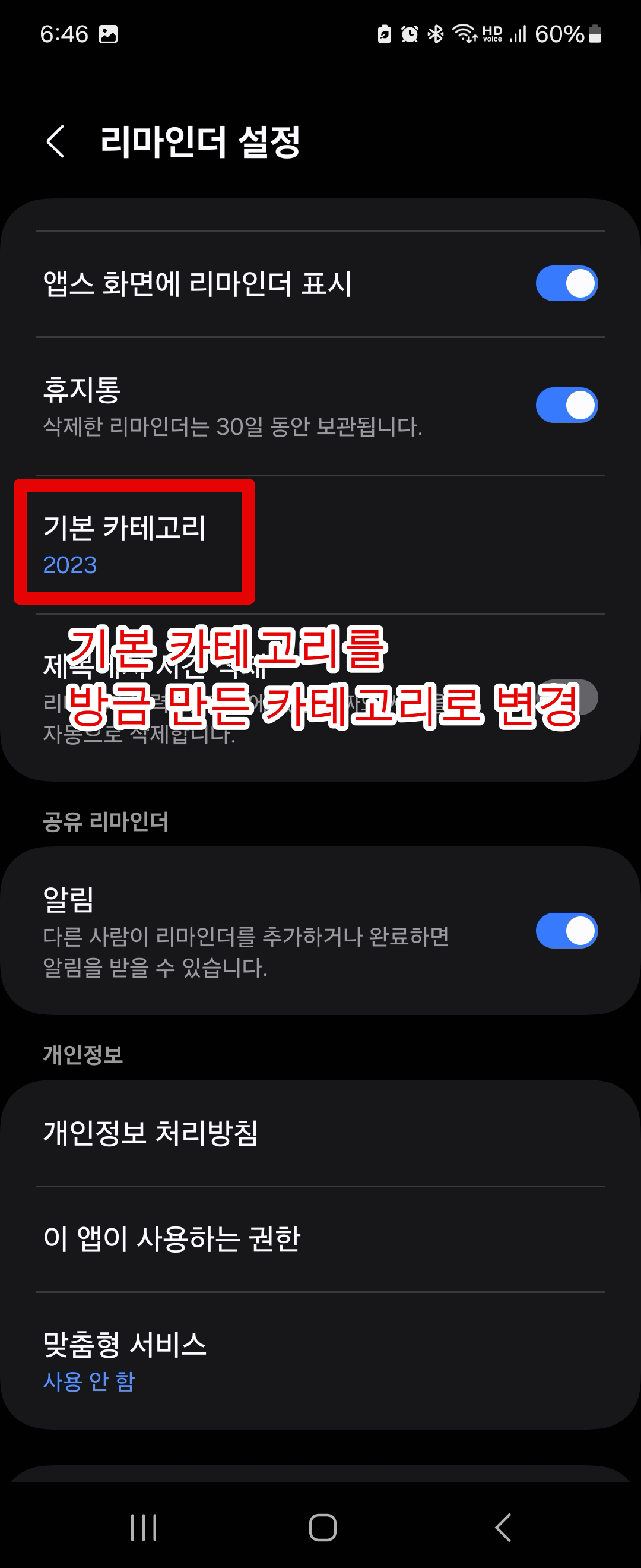 갤럭시 리마인더 앱을 실행한 후 왼쪽 메뉴에서 [설정]으로 들어가줍니다. 다음으로 [Microsoft To do에 동기화]를 활성화해줍니다. 다음으로 스크롤을 아래쪽으로 내려서 [기본 카테고리]를 위에서 마이크로소프트 To do 웹앱에서 만든 새로운 카테고리로 설정해줍니다.