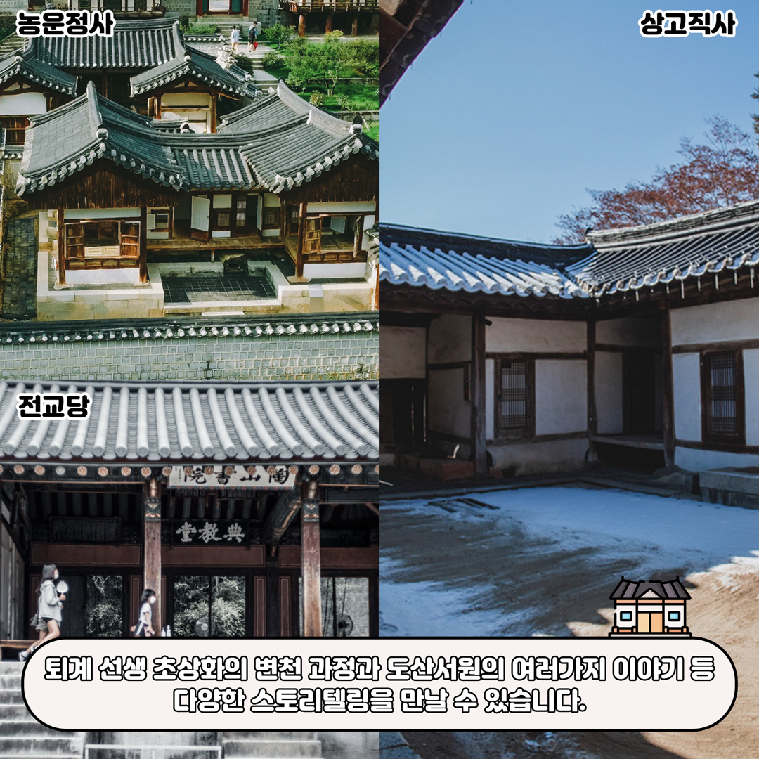 한국 성리학과 철학적 사유가 깃든 도산서원. 퇴계선생의 자연사랑과 학문적 철학이 묻어나는 도산서당, 인재 등용 이야기, 건축물 이야기 등 다양한 스토리텔링을 만날 수 있는 여행 프로그램입니다.