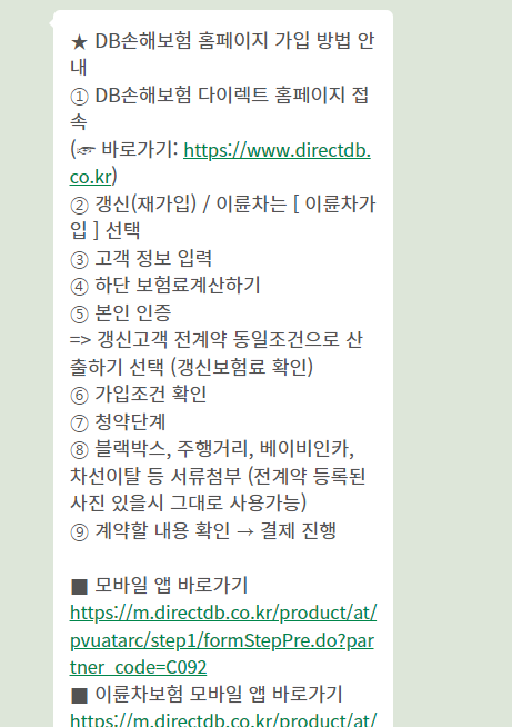- 같은 보험사(DB손해보험 등)에서 다이렉트로 갈아탈 경우, 기존 데이터가 연동되어 있어서 설계 내용 포함 더 편하게 다이렉트로 가입이 가능했음