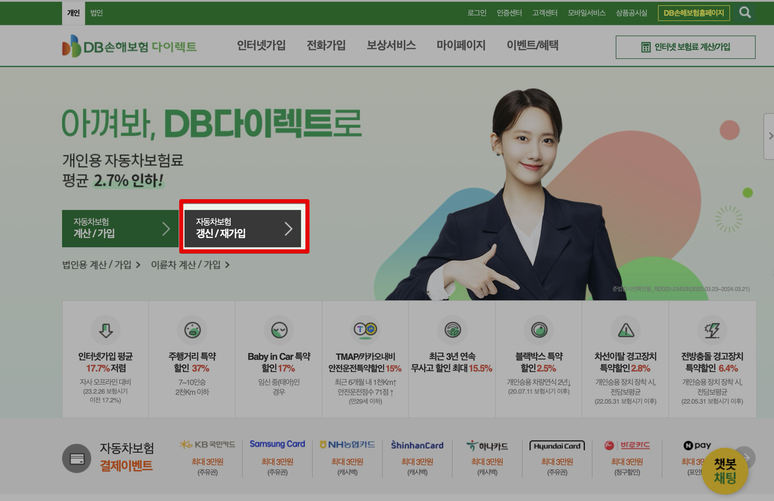 다이렉트 보험으로 갱신하는 방법은 간단합니다. 일단 DB손해보험(또는 기존에 보험사) 홈페이지로 접속한 다음 로그인을 해주세요. 저는 공인인증서로 로그인하여 진행하였습니다.