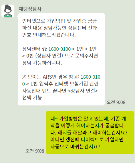 - 기존에 설계사 보험은 따로 갱신하거나 해지할 필요는 없는 것 같고, 갱신하지않고 그대로 만료되도록 두면 되는 듯