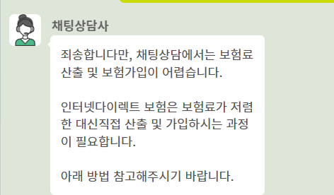 이후 채팅상담에서는 보험료 산출 및 보험가입은 안된다고 답변 받았는데 그 부분은 어느정도 인지하고 있었던 부분이며, 실제로 얻을 수 있었던 정보는 인터넷 다이렉트 보험이 보험료가 가장 저렴하지만 설계 및 산출을 직접해야하는 부분이 있다는 점이었습니다.