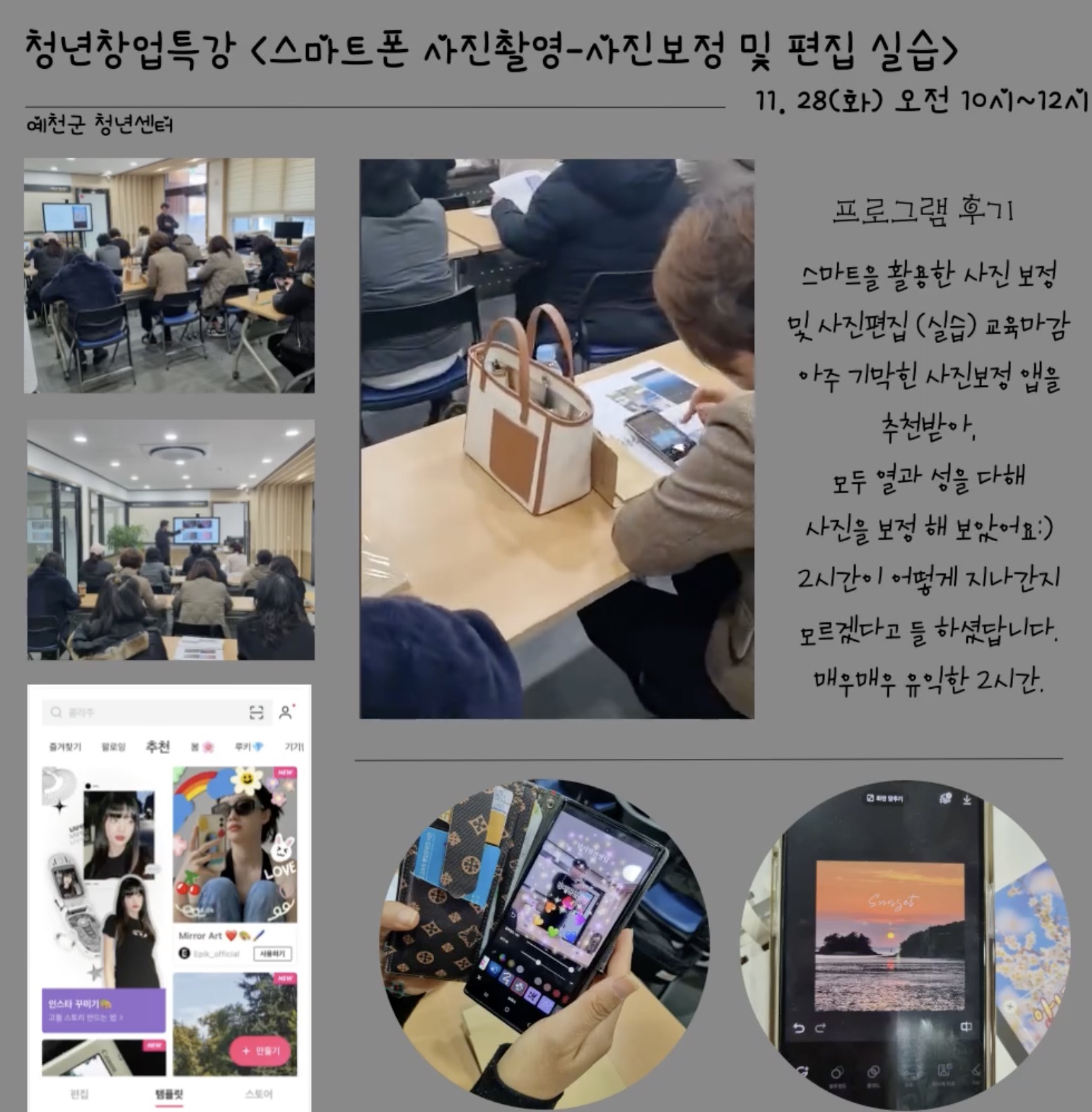 - 강의제목 : 청년 창업 특강 - 스마트폰 사진 촬영 및 사진 편집 보정