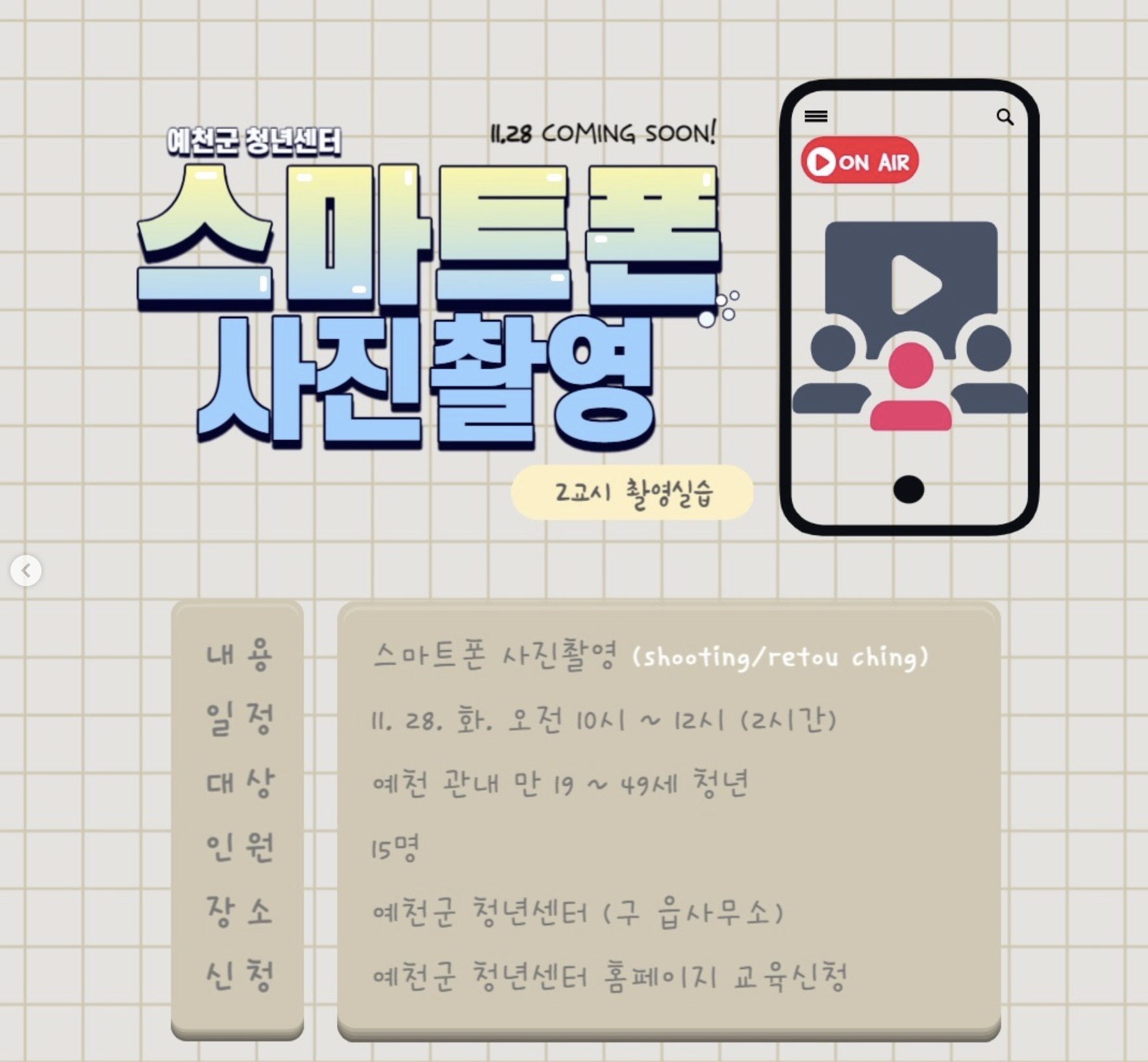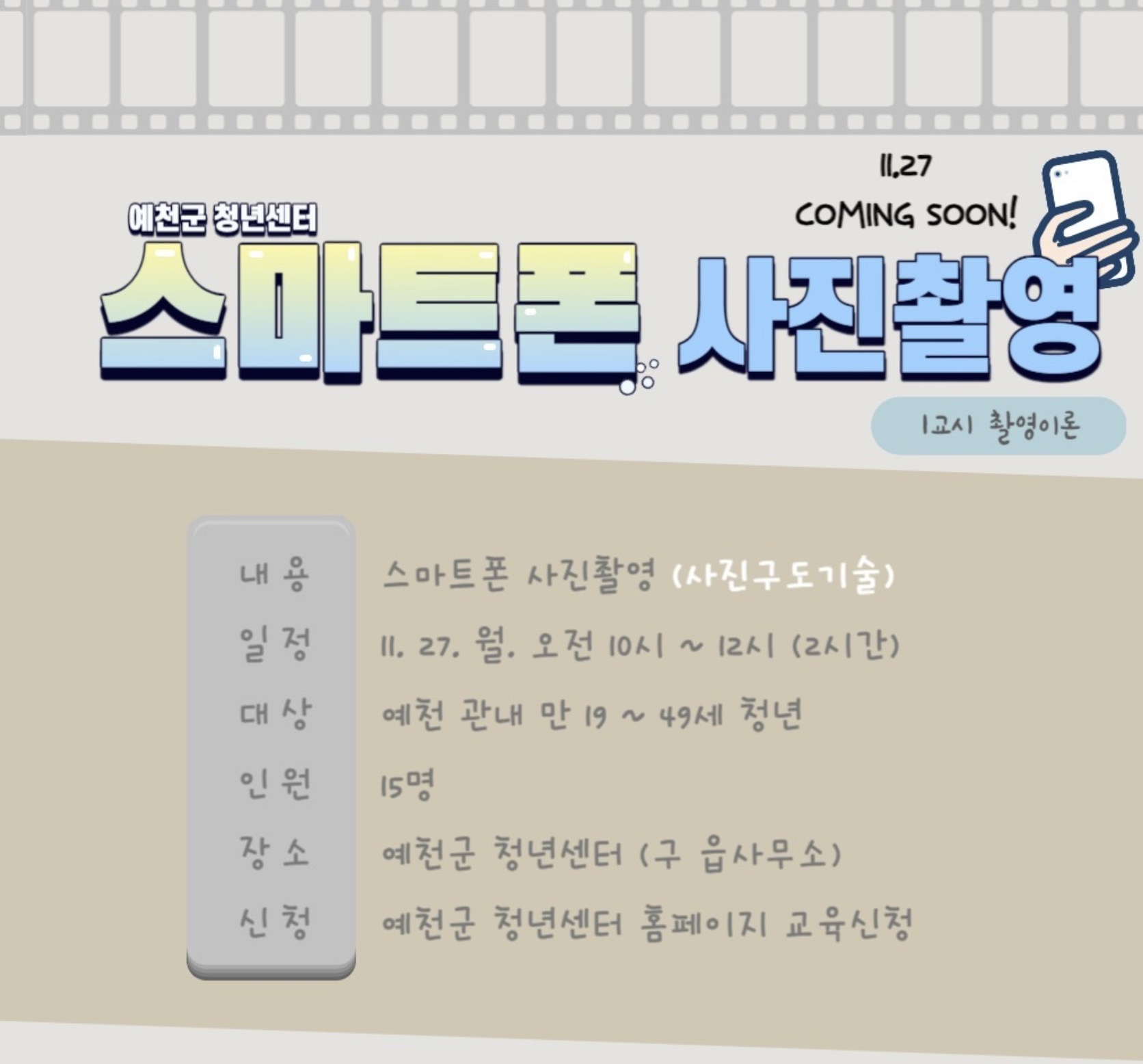 청년 창업 특강 스마트폰 사진촬영 및 사진 편집 - 예천군 청년센터
