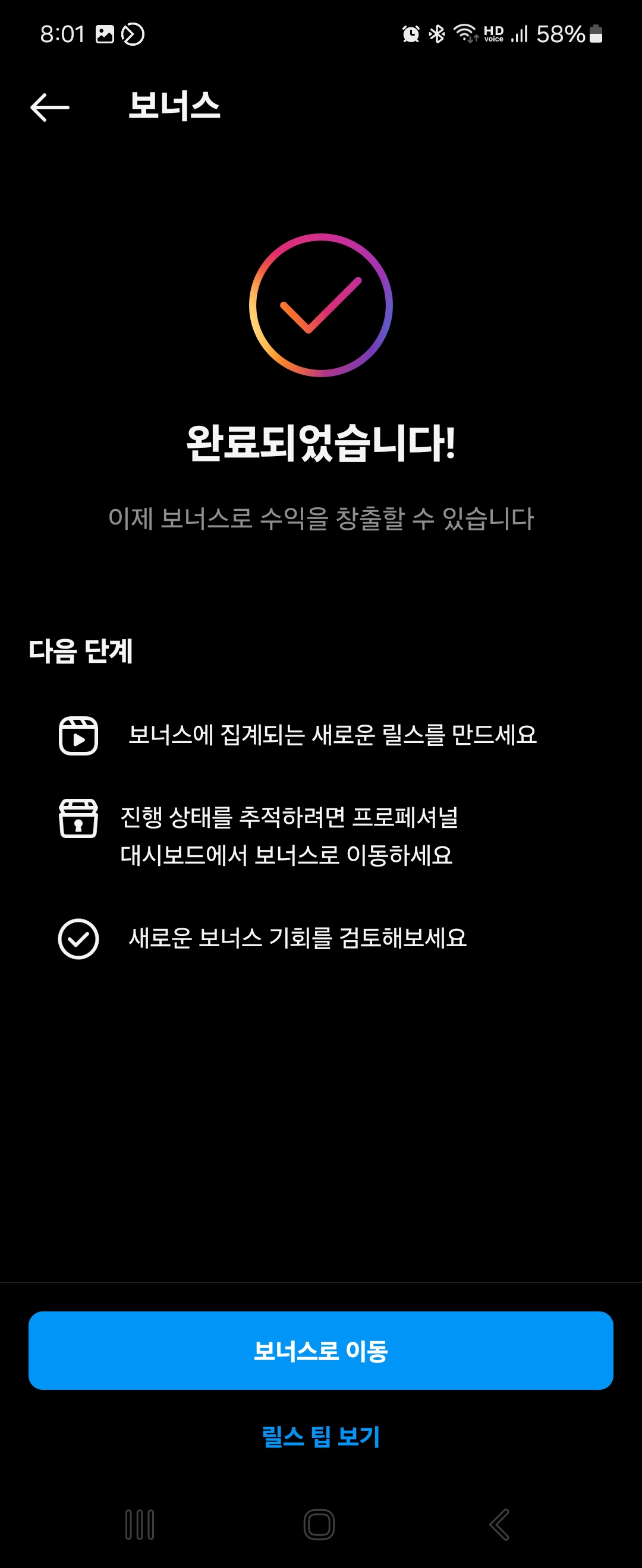 그래서 만약 보너스 기능을 활성화하고 싶다면 최소 인스타그램 팔로워 1만명 + 어느정도 조회수가 잘 나와있는 릴스 여러개가 업로드된 상태가 되어야 보너스 기능이 활성화 될 것으로 보입니다.
