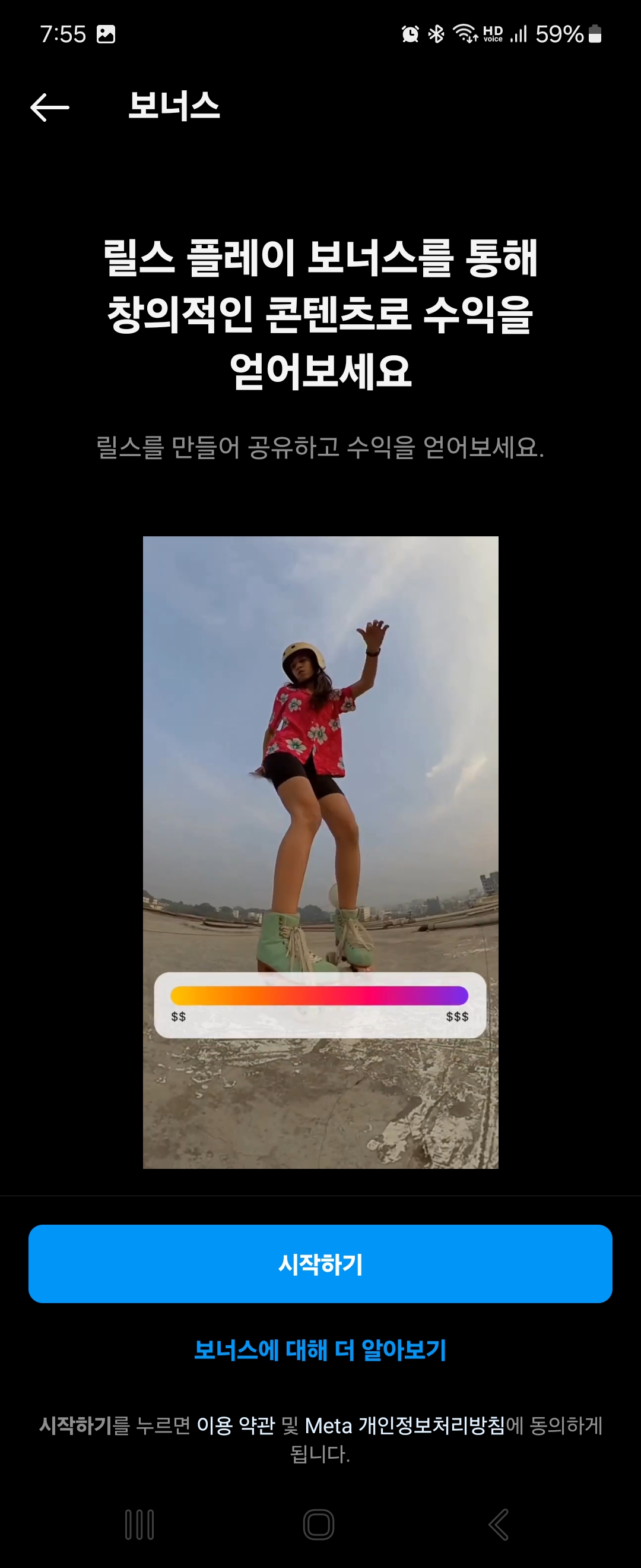 [보너스 시작하기]를 클릭하면 위 그림처럼 나옵니다. 릴스 플레이 보너스를 통해 창의적인 콘텐츠로 수익을 얻어보세요라고 하네요.