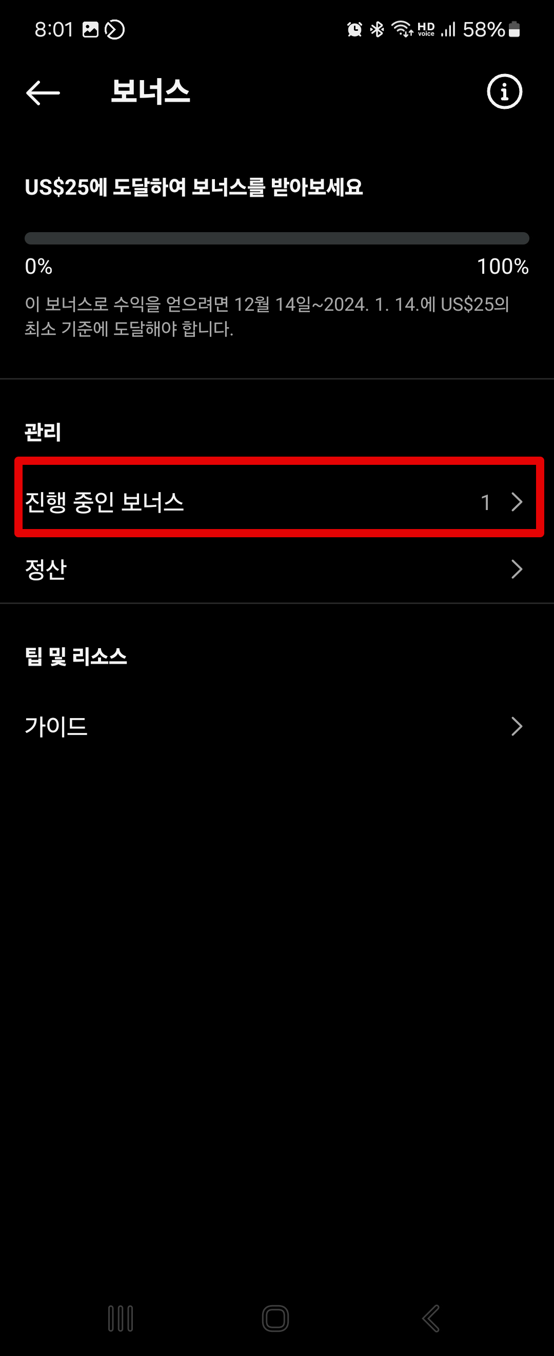 이제 보너스를 활성화했으니 보너스에 적용되는 릴스를 열심히 올리면 되겠죠? 테스트로 릴스 1편을 올려봤더니 [관리]에서 [진행 중인 보너스]에 1편이 등록된 모습을 볼 수 있었습니다.