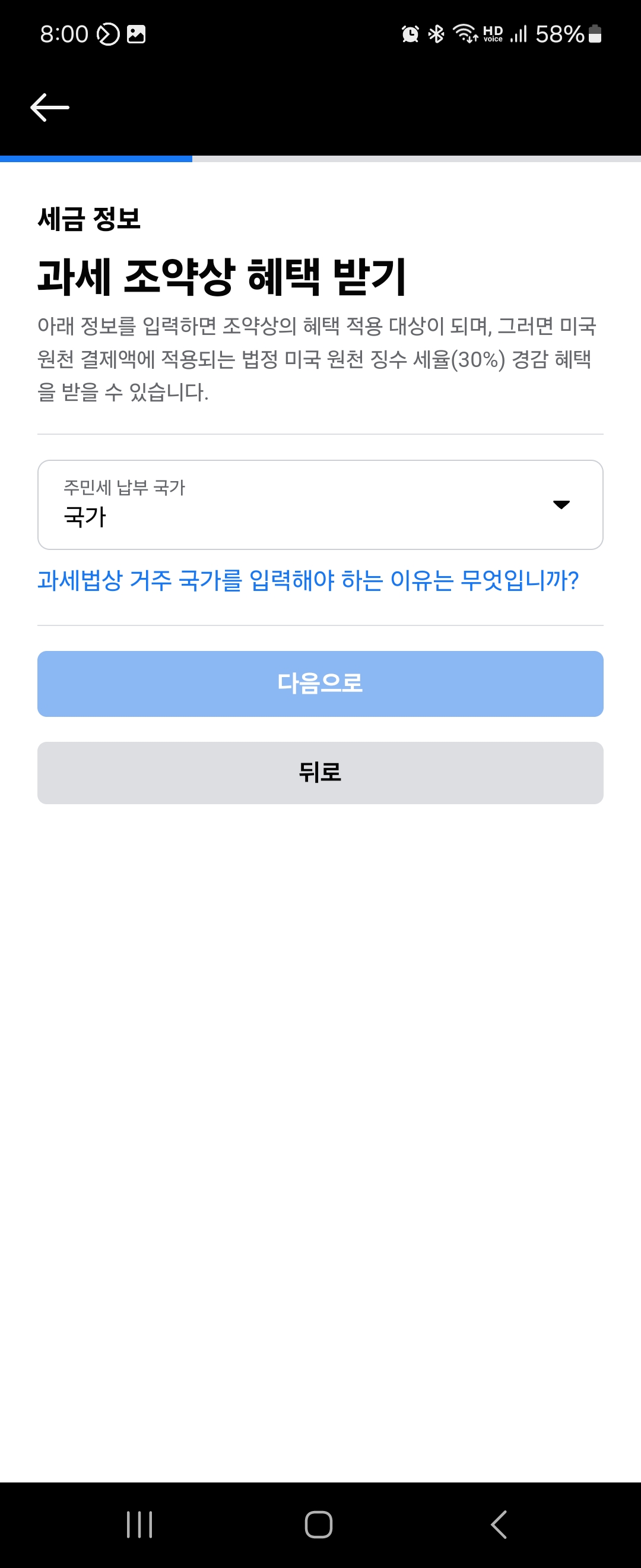 다음으로 과세 조약상 혜택 받기 창이 나타납니다. 대한민국의 경우 조약상 혜택이 제공된다고 합니다. 주민세 납부 국가를 대한민국으로 설정하면 됩니다. 그럼 세금 프로필이 나타나는데 바로 이렇게 나타나는 이유는 인스타그램 기프트를 설정할 때 해당 정보를 입력했기 때문입니다.