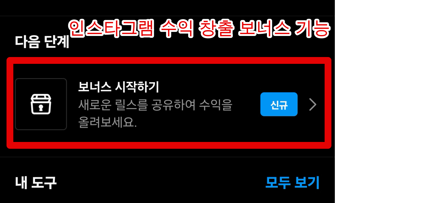 인스타그램 자기 프로필에서 [프로페셔널 대시보드]로 들어가게 되면 중간쯤에 [다음 단계]에서 [보너스 시작하기] 메뉴가 보이게 됩니다.(모든 사용자에게 보이는건 아니고 현재 활성화된 계정 기준으로만 보이는 것 같습니다)