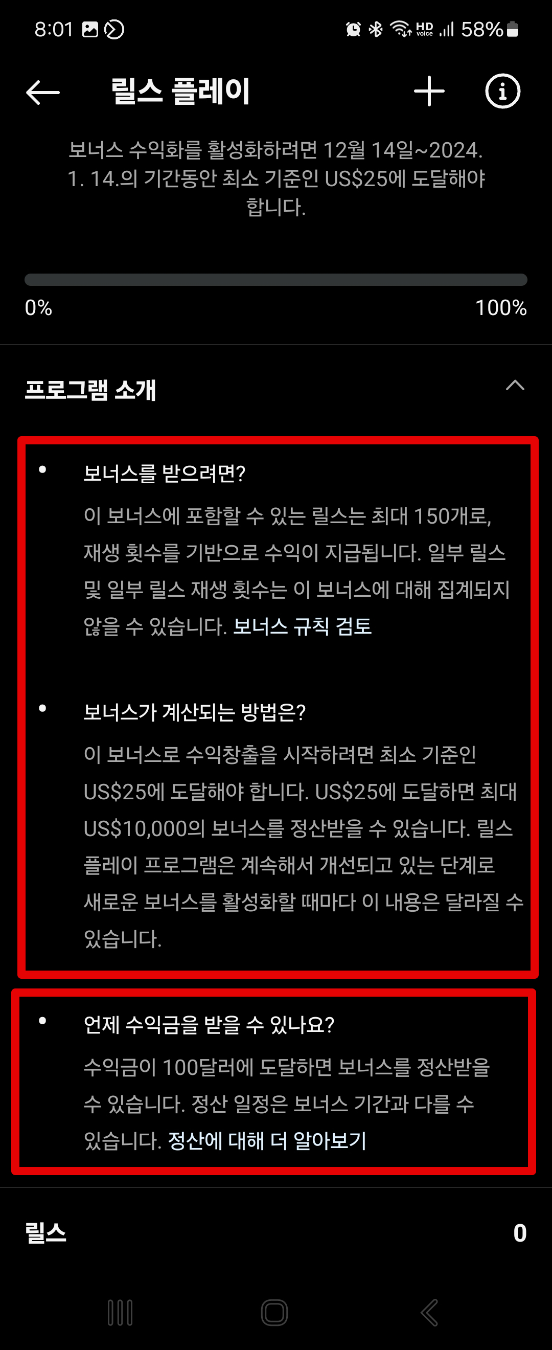 보너스에 포함할 수 있는 릴스는 최대 150개라고 합니다. 그런데 인스타그램 보너스 수익화 기능의 경우, 기간이 정해져 있는 것 같습니다. 특정 기간안에 특정 수익을 창출해야만 보너스를 활성화할 수 있는 시스템입니다. 계속... 무한반복으로 릴스를 올리라는 의미 같습니다...