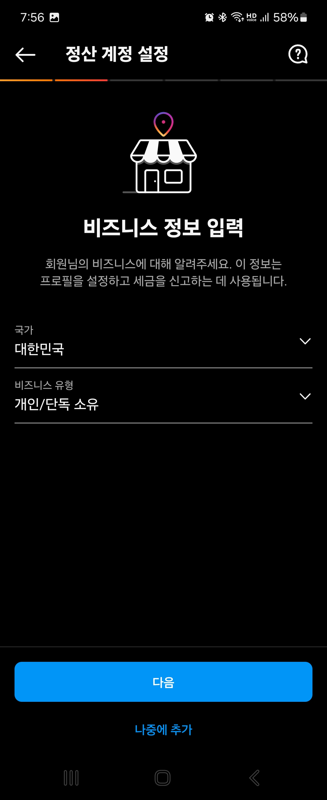 [시작하기]를 누르면 기본정보를 입력하는 창이 나오고, 다음으로 비즈니스 정보를 입력하는 창이 나옵니다. [비즈니스 유형]에는 [개인/단독소유]를 선택해줍니다.
