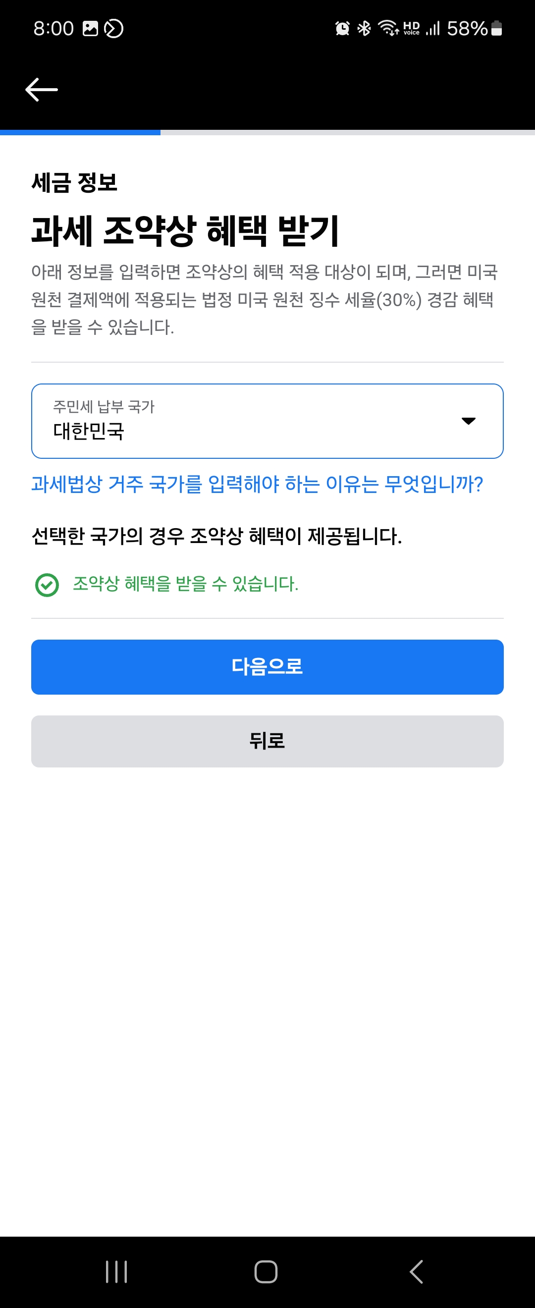 다음으로 과세 조약상 혜택 받기 창이 나타납니다. 대한민국의 경우 조약상 혜택이 제공된다고 합니다. 주민세 납부 국가를 대한민국으로 설정하면 됩니다. 그럼 세금 프로필이 나타나는데 바로 이렇게 나타나는 이유는 인스타그램 기프트를 설정할 때 해당 정보를 입력했기 때문입니다.