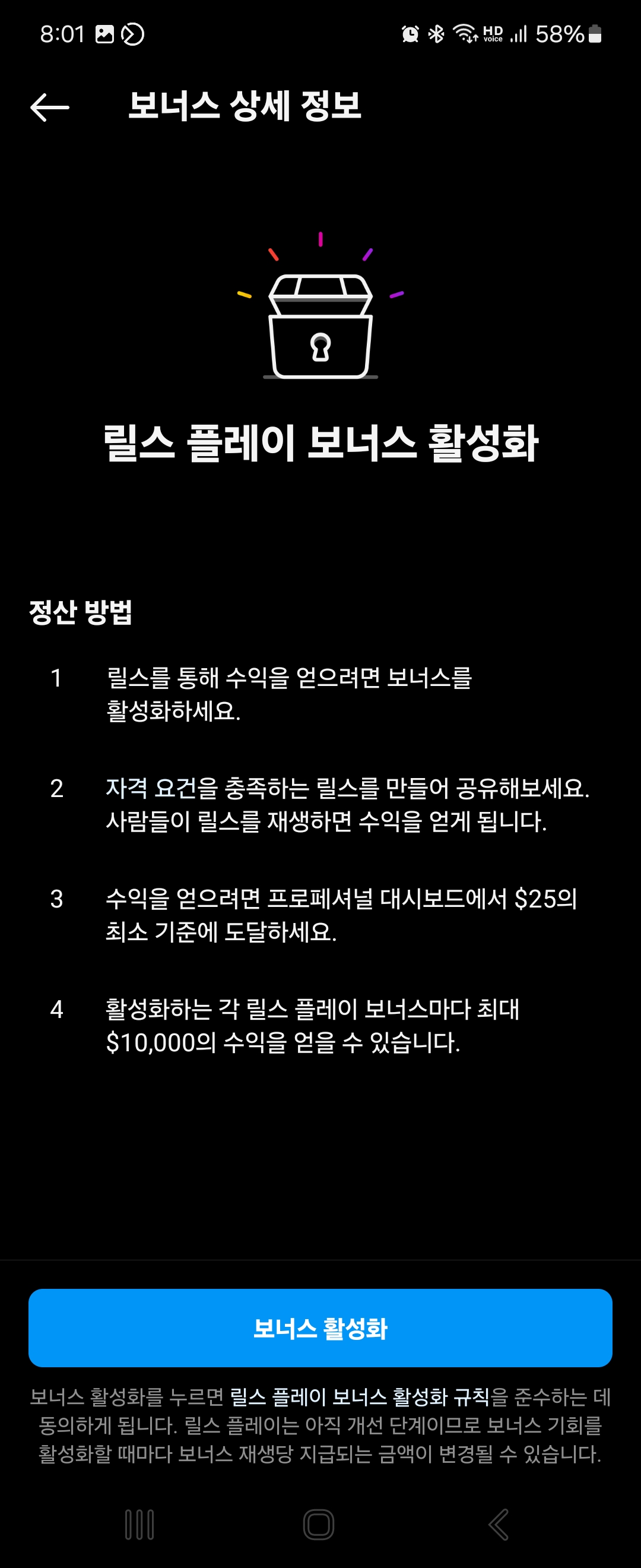 그래서 만약 보너스 기능을 활성화하고 싶다면 최소 인스타그램 팔로워 1만명 + 어느정도 조회수가 잘 나와있는 릴스 여러개가 업로드된 상태가 되어야 보너스 기능이 활성화 될 것으로 보입니다.
