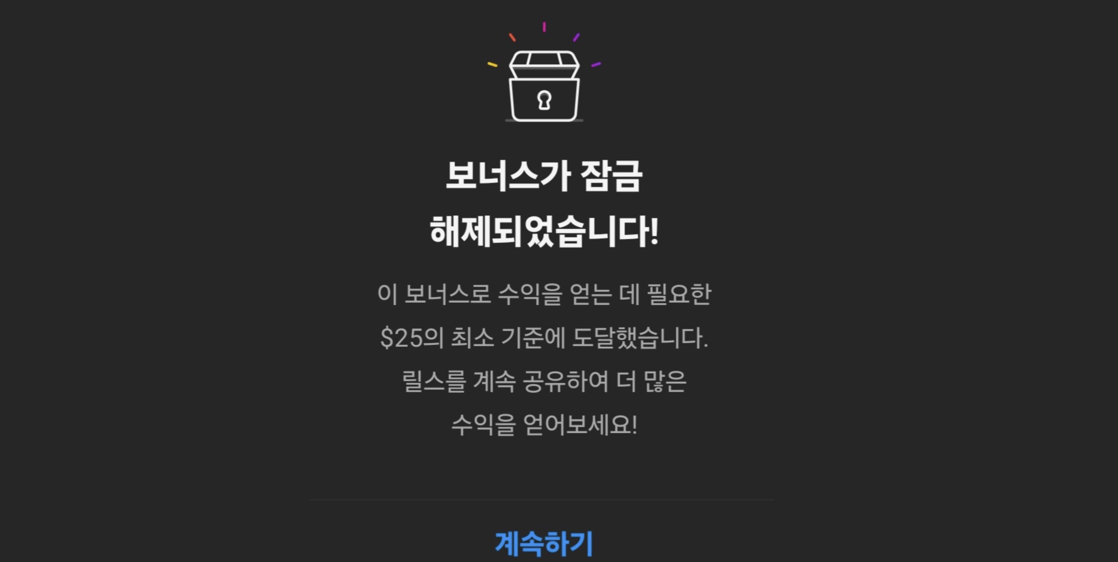 "보너스가 잠금해제되었습니다!"라고 나오면서 "이 보너스로 수익을 얻는게 필요한 $25의 최소 기준에 도달했습니다. 릴스를 계속 공유하여 더 많은 수익을 얻어보세요!"라고 합니다. 게시물에도 보너스를 적용해주면 좋겠는데 아쉽게도 인스타그램에서는 현재 릴스에만 보너스를 제공해주고 있습니다.