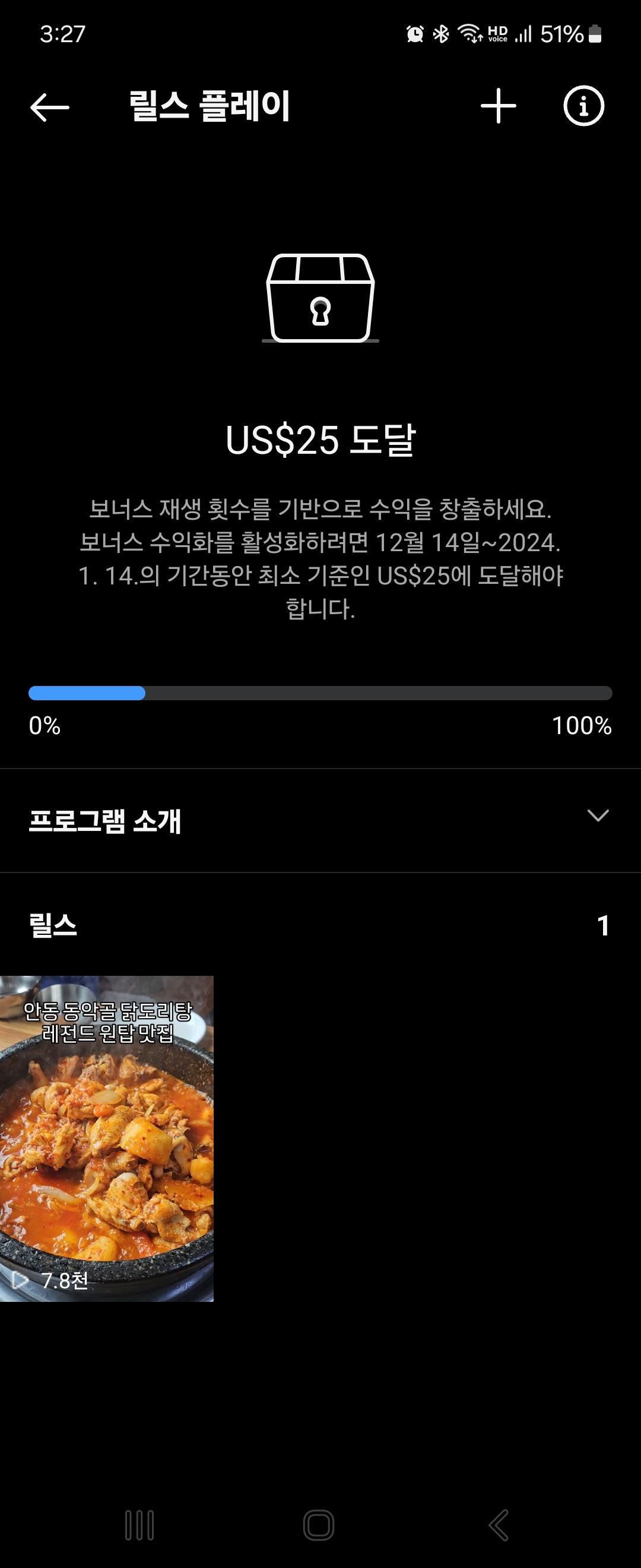 그러니까 정리하자면, 릴스 플레이 보너스의 기준 충족이 되는 처음 $25 수익 창출의 경우 약 5만회 정도의 릴스 조회수가 필요하며 이걸 한달이라는 기간동안에 달성해야합니다.