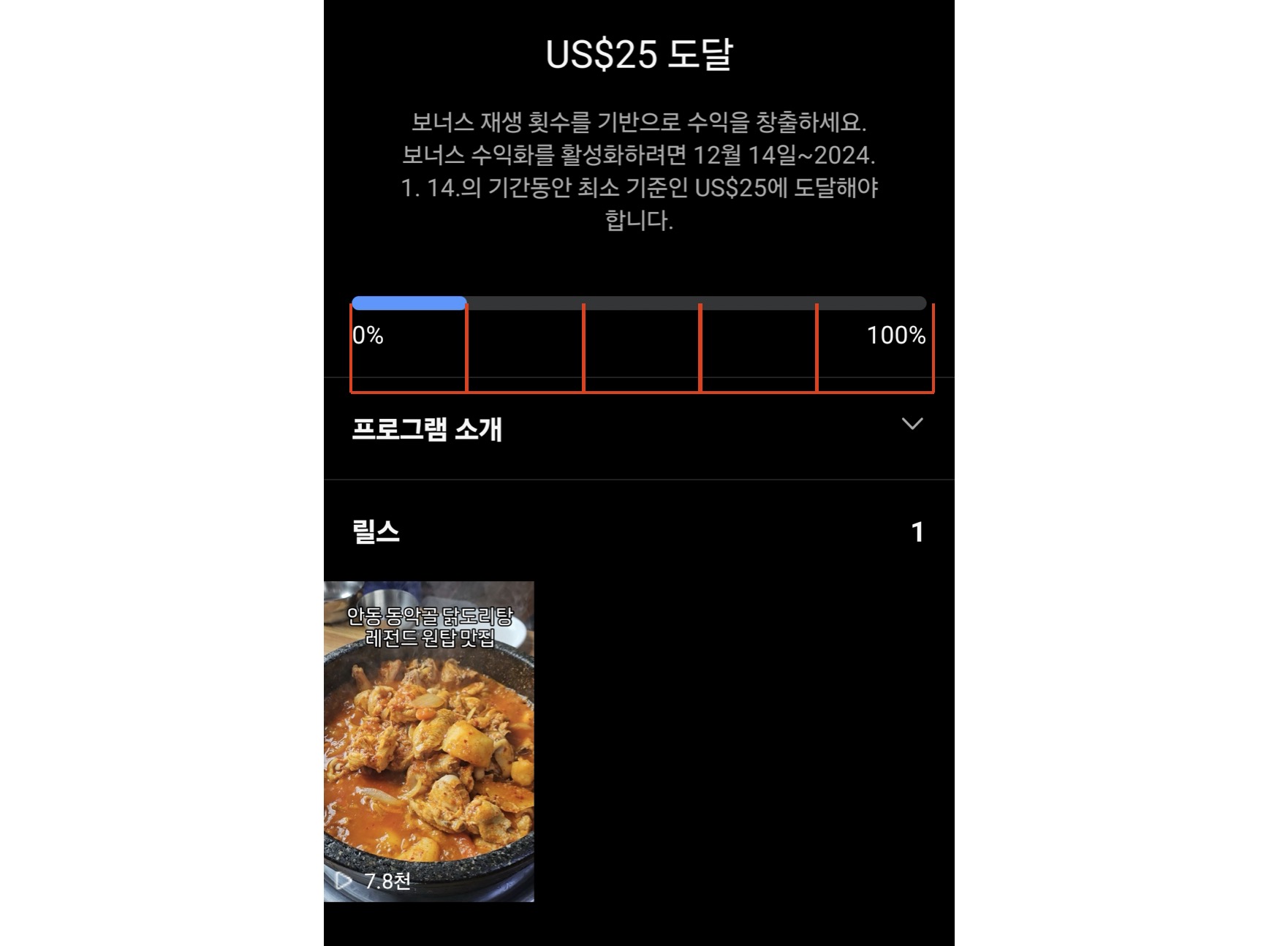 일단 여기까지 설정하게 되면, 인스타그램 릴스를 통해 보너스의 잠금해제를 해야합니다. 한달동안의 기간이 주어지고 그 기간동안 총 $25에 달하는 수치를 달성해야 보너스 잠금이 해제되는 방식인데요.