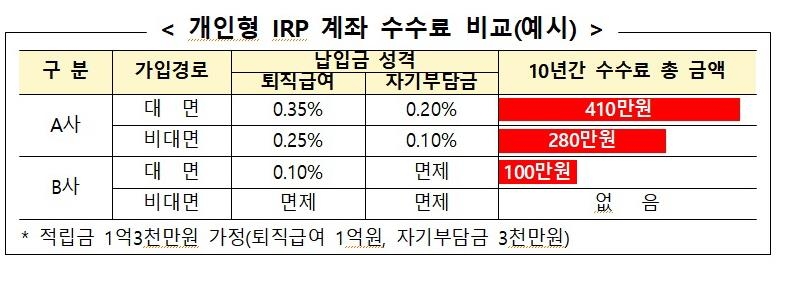 금융감독원 자료를 살펴보면, 개인형 IRP 계좌의 수수료의 경우 자기부담금과 퇴직급여 기준으로 0.35%와 0.2%만 추가되어서 10년간 수수료 총 금액이 410만원으로 크게 증가하게 됩니다. 따라서 개인연금저축펀드 계좌 뿐만 아니라 IRP 계좌의 경우에도 약 20년 정도 투자 및 유지한다고 가정했을 때, 장기투자가 되므로 수수료를 절약할 필요 있습니다.