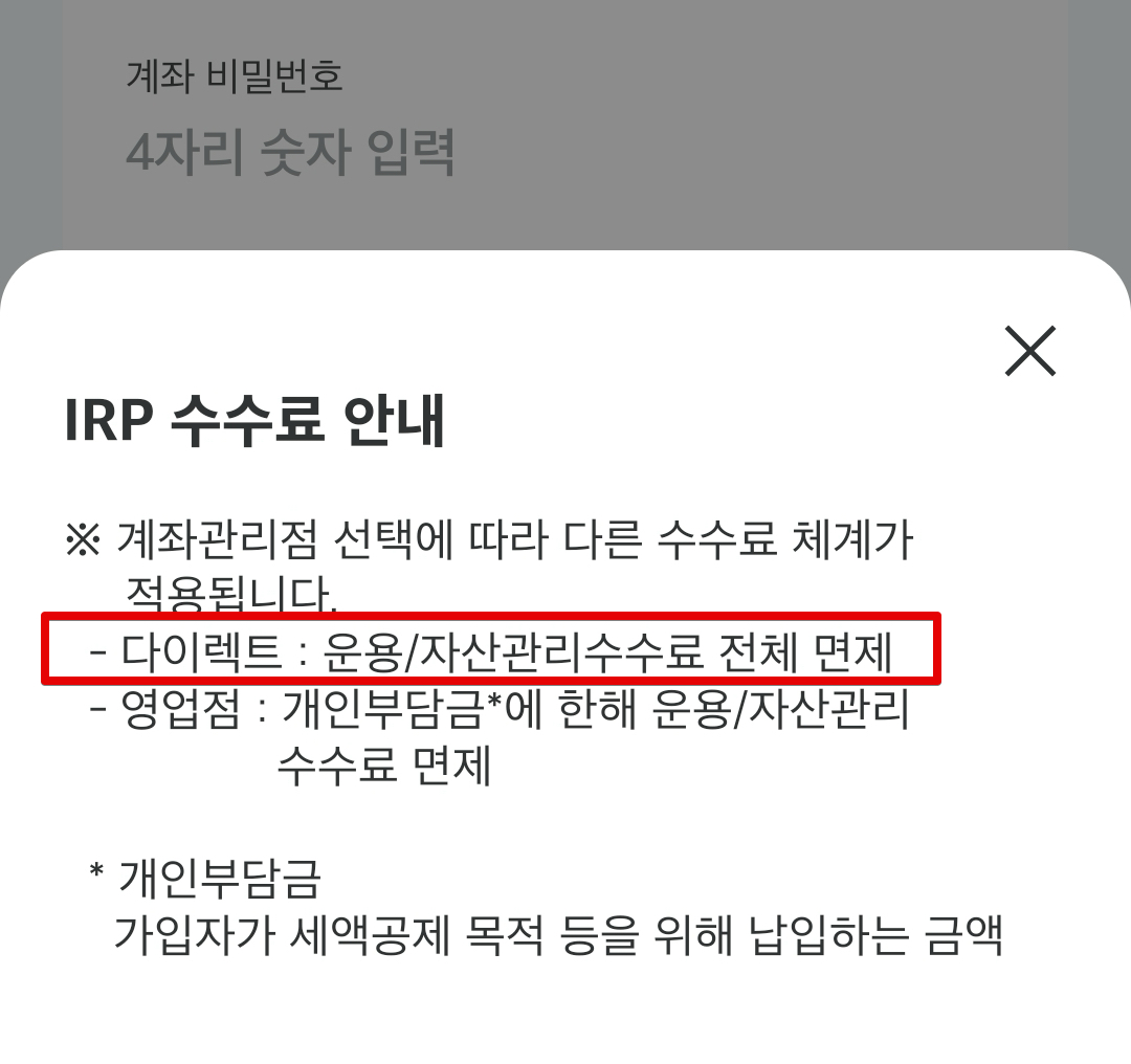 다이렉트 가입(모바일 앱 가입)의 경우 수수료 전체 면제라고 돼 있습니다만, 실제로는 영업점에서 가입할 경우 자기부담금만 면제이고, 퇴직급여에 대해서는 수수료가 부과됩니다. 따라서 어떤 경우에도 가입을 진행할 때 비대면으로 스마트폰 앱으로 가입하는게 무조건 유리합니다.