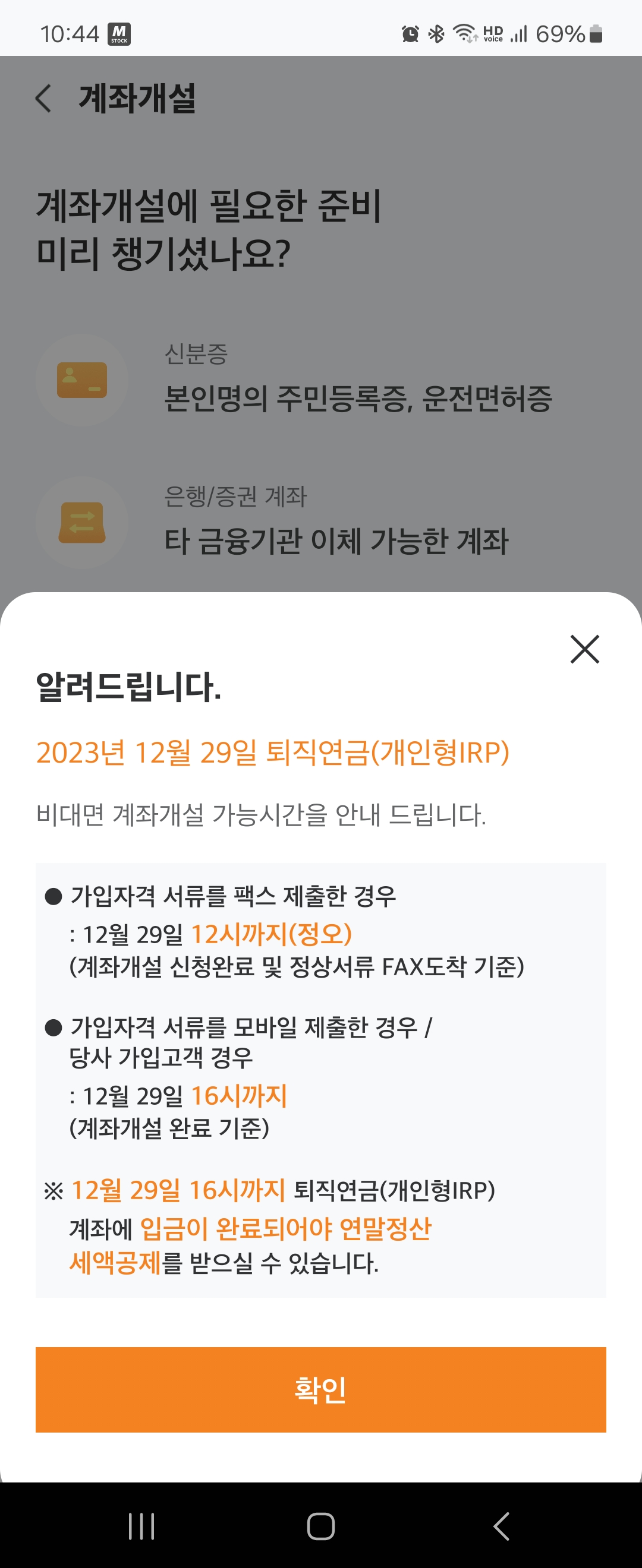 퇴직연금 개인형 IRP 계좌의 경우, 제 생각에는 마감일 기준 최소 하루 전에는 가입신청이 들어가야할 것 같아요. 서류 제출 후 검토 및 승인 후 계좌개설이 열릴 때 까지 몇 시간 정도가 걸리더라고요. 그래서 예를들어 29일이 마감일이면, 28일에는 계좌개설 신청을 하는게 좋을 것 같고 스트레스 안받을 것 같네요.