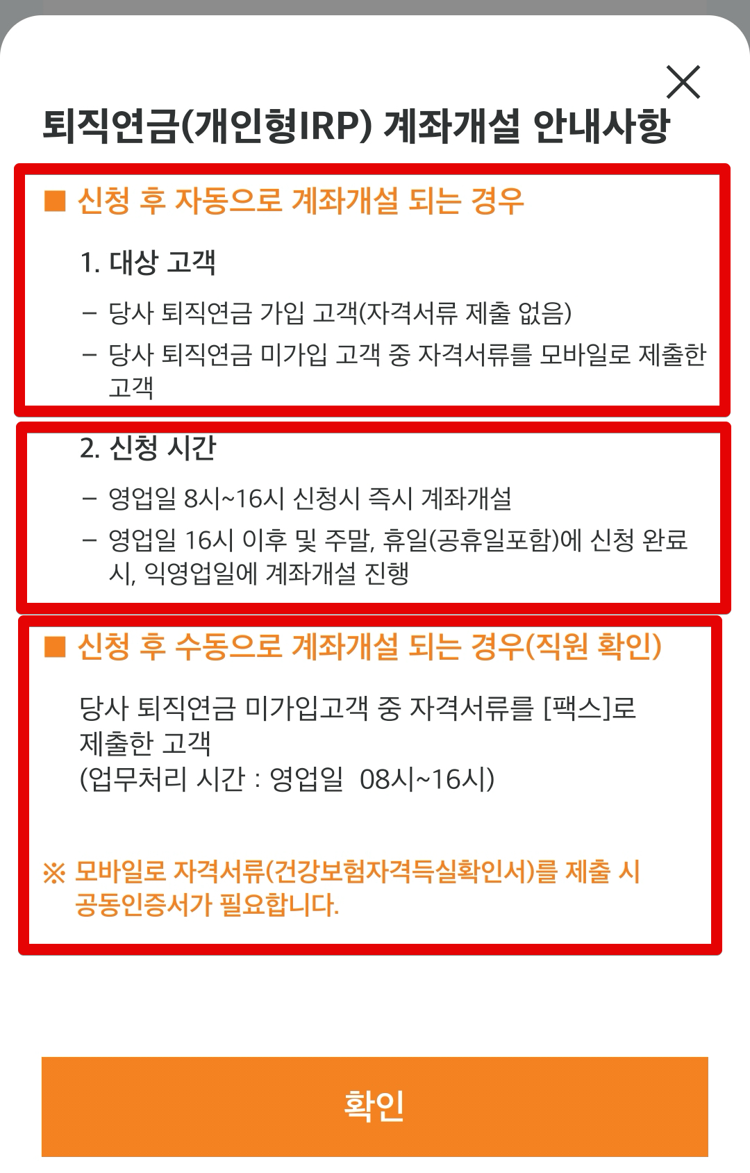 퇴직연금 개인형 IRP 계좌의 경우 조금 특이한 구조를 갖고 있어서 안내사항이 먼저 표시되는데요. 신청 후 자동으로 계좌개설이 되는 케이스가 있고 신청 후 별도로 서류를 제출해서 심사 통과 후 계좌개설이 되는게 있습니다. 자격서류의 경우, 종류에 따라서 모바일 앱에서 내는게 있고 별도로 팩스로 보내는게 있는데요.