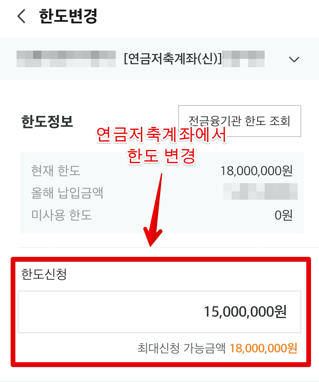 일단 연금저축계좌를 미리 만들고 나중에 IRP 계좌를 개설하는 경우 한도를 설정해야합니다. 기본적으로 연금계좌는 다 더해서 총합으로 1년에 1800만원 납입한도를 갖고 있습니다. 그런데 처음에 연금계좌를 만들 때 한도를 1800만원으로 설정해놓으면, 남은 한도가 없기 때문에 IRP 계좌를 만들 때 한도를 추가할 수 없게 됩니다. 따라서 기존에 있던 연금저축계좌의 한도를 변경해서 여유를 만들어주고 그 여유분만큼 IRP 계좌를 만들면서 한도를 지정해야합니다.