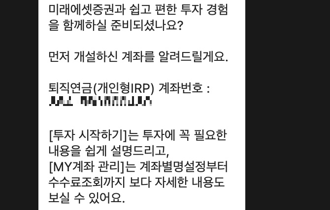 이후 계좌개설이 되면 이렇게 알림톡으로 계좌개설이 완료되었다고 알려줍니다. 계좌번호를 볼 수 있으며 이때부터 미래에셋증권 앱에서 개인형 IRP 계좌를 확인할 수 있습니다.