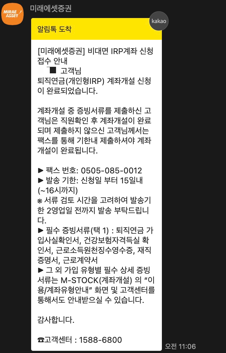 내용을 요약하면, 비대면으로 IRP 계좌 신청이 접수되었고, 계좌개설 증빙서류를 팩스로 제출하라는 내용입니다. 그런데 알림톡에서는 필수 증빙 서류로서 사업자등록증이 보이지 않는데, 위에서 앱에서 가입할 때 사업자등록증이 있어서 제가 계좌 개설할 때 사업자등록증을 팩스로 제출해봤는데 계좌개설이 정상적으로 진행이 되었습니다. (사업자등록증은 발급 3개월 이내에 한 걸로, 최신으로 제출해야합니다.)