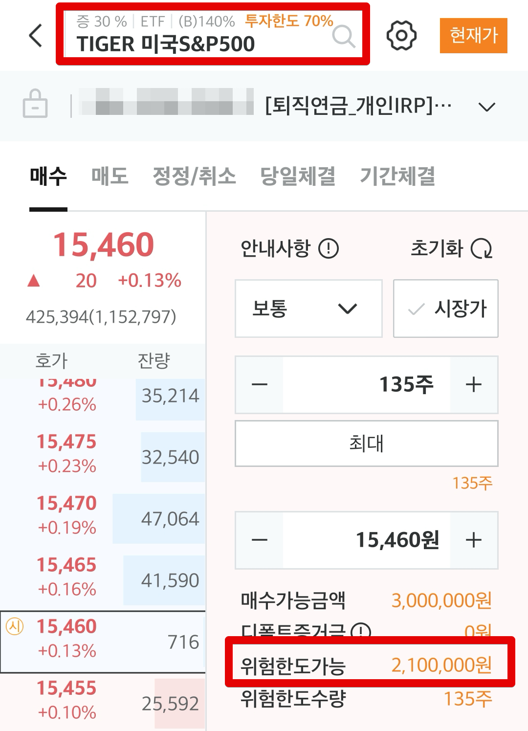 그래서 이번에 IRP 계좌개설 후 입금하고, 그 예수금으로 위험자산 70%에서는 미국 S&P500 ETF를 매수해주었습니다.