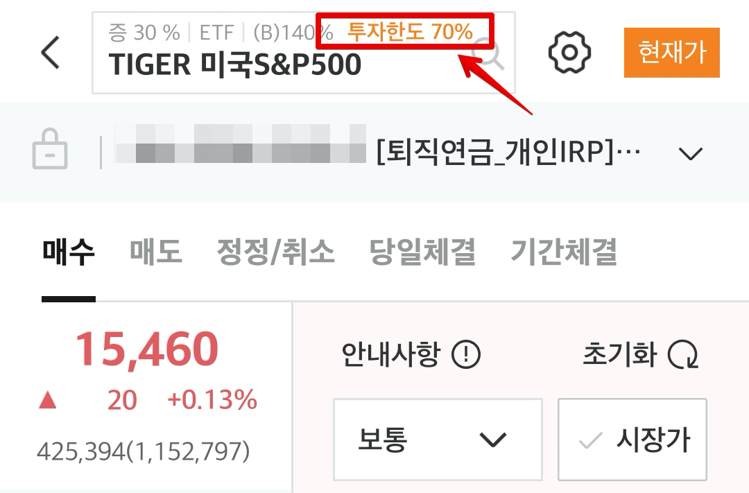 위험자산 상품, ETF로 들어오게 되면, 제일 위쪽에 [투자한도 70%]라고 된 문구를 볼 수 있습니다. 일반 계좌에서는 나타나지 않던 문구로서 IRP 계좌에만 해당하는 부분입니다. 나머지는 일반 주식계좌에서 매수하는것과 똑같습니다. 매수를 진행해주면, 아래쪽에 매수하기 버튼이 사라지고 매입금액과 보유내역이 나타납니다.