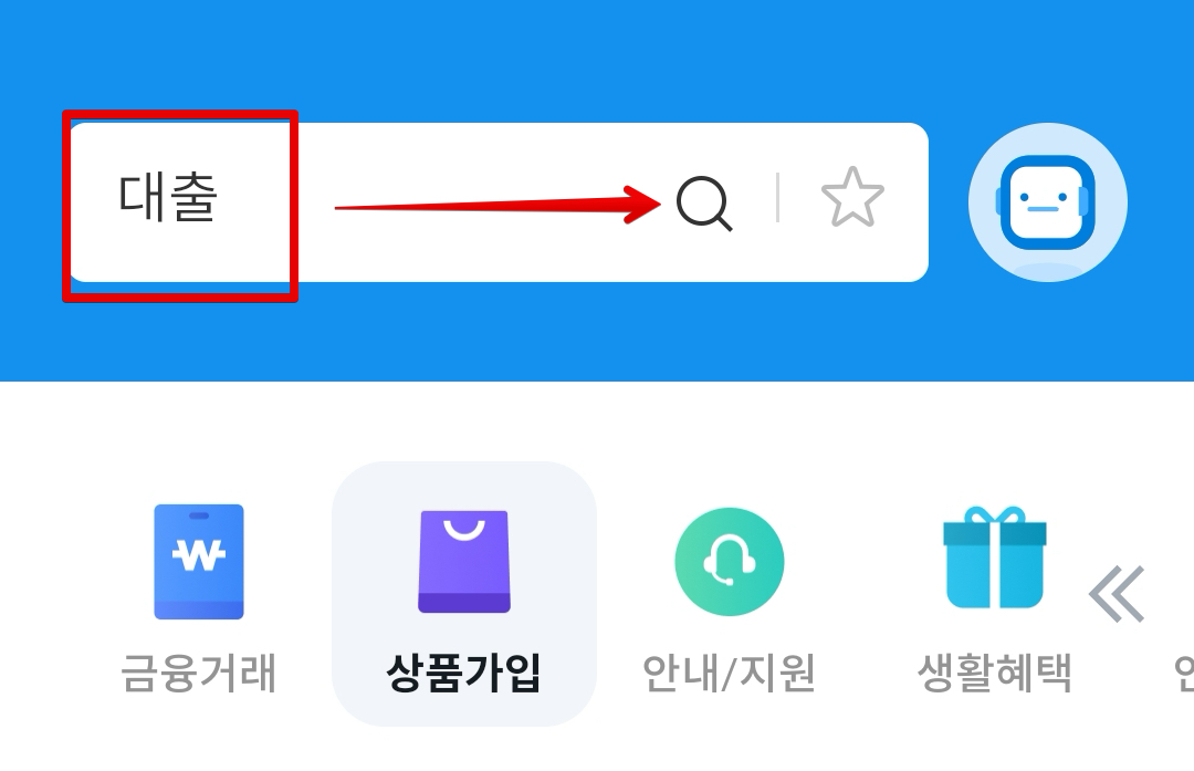 대출 신청을 위해서 우리은행 메뉴에서 검색창에 [대출]이라고 검색합니다.