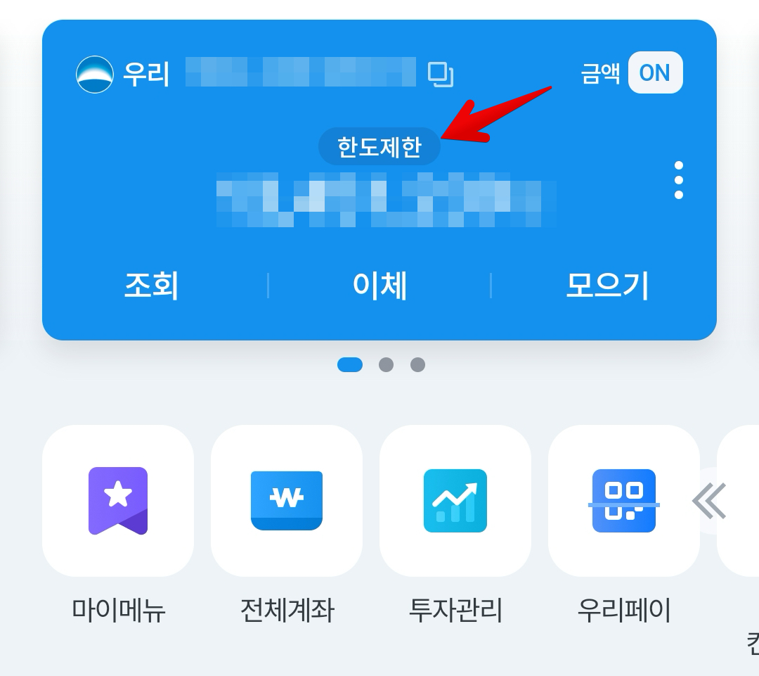 우리은행 앱에서 계좌를 살펴보면 위쪽에 한도제한이라는 글자가 보이면서 한도제한 계좌임을 알려줍니다.