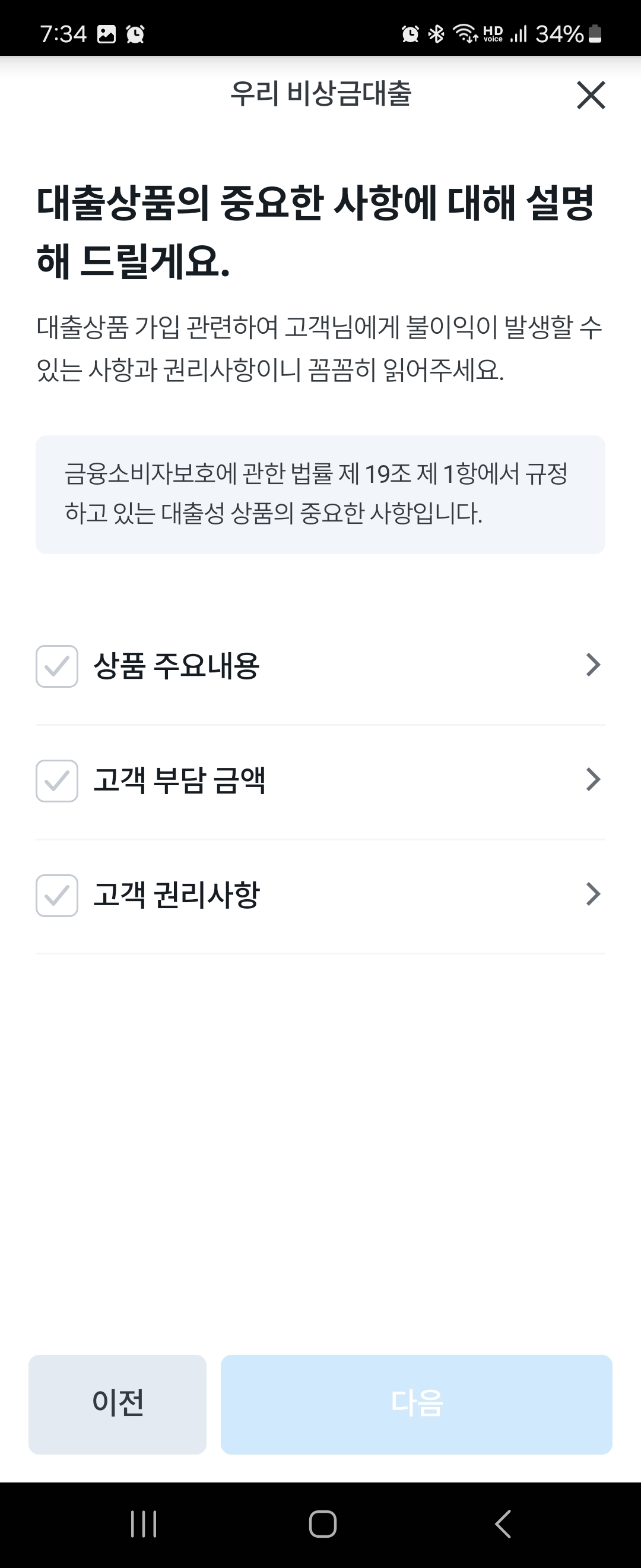 우리은행 비상금대출 상품의 경우 비대면 대출계약 상환이 가능하다고 표시됩니다. 여기에서 이 창을 끄지말고 꼭 [확인]을 눌러서 이어서 진행해주세요.